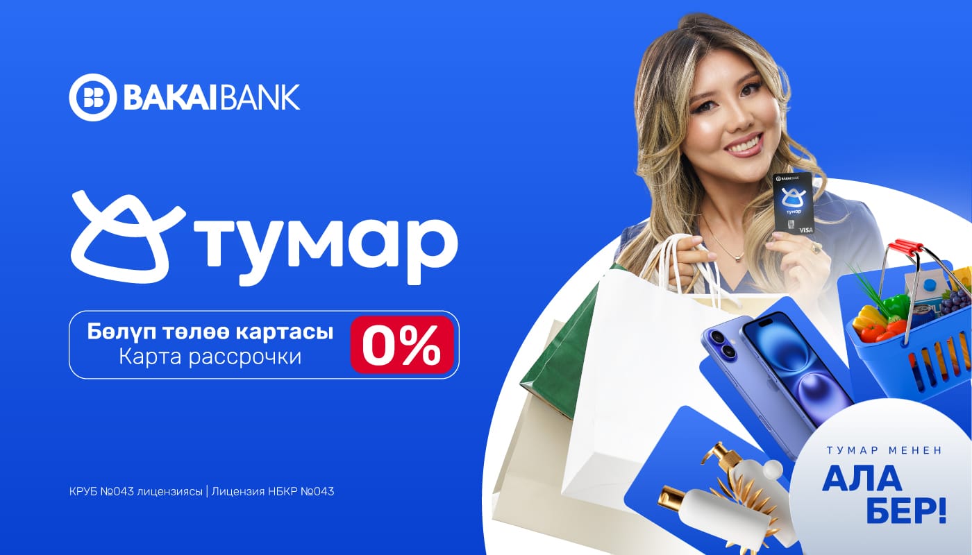 Сенсация! Встречайте карту рассрочки «Тумар» от Bakai Bank — теперь можно покупать то, что хочется, сразу, а платить — частями. Рассрочка до 12 месяцев, никаких процентов, никаких скрытых условий. Просто, удобно, прозрачно.