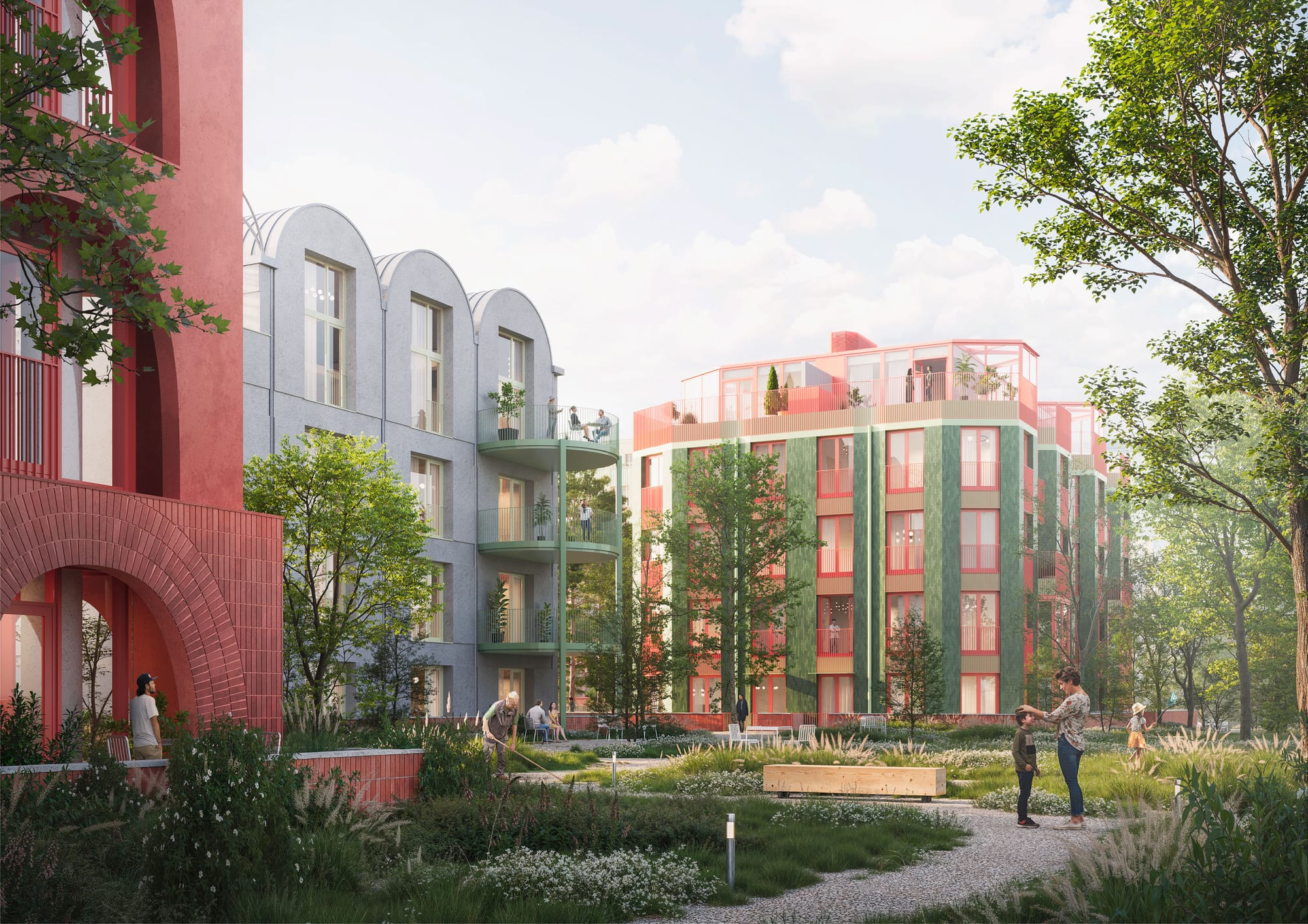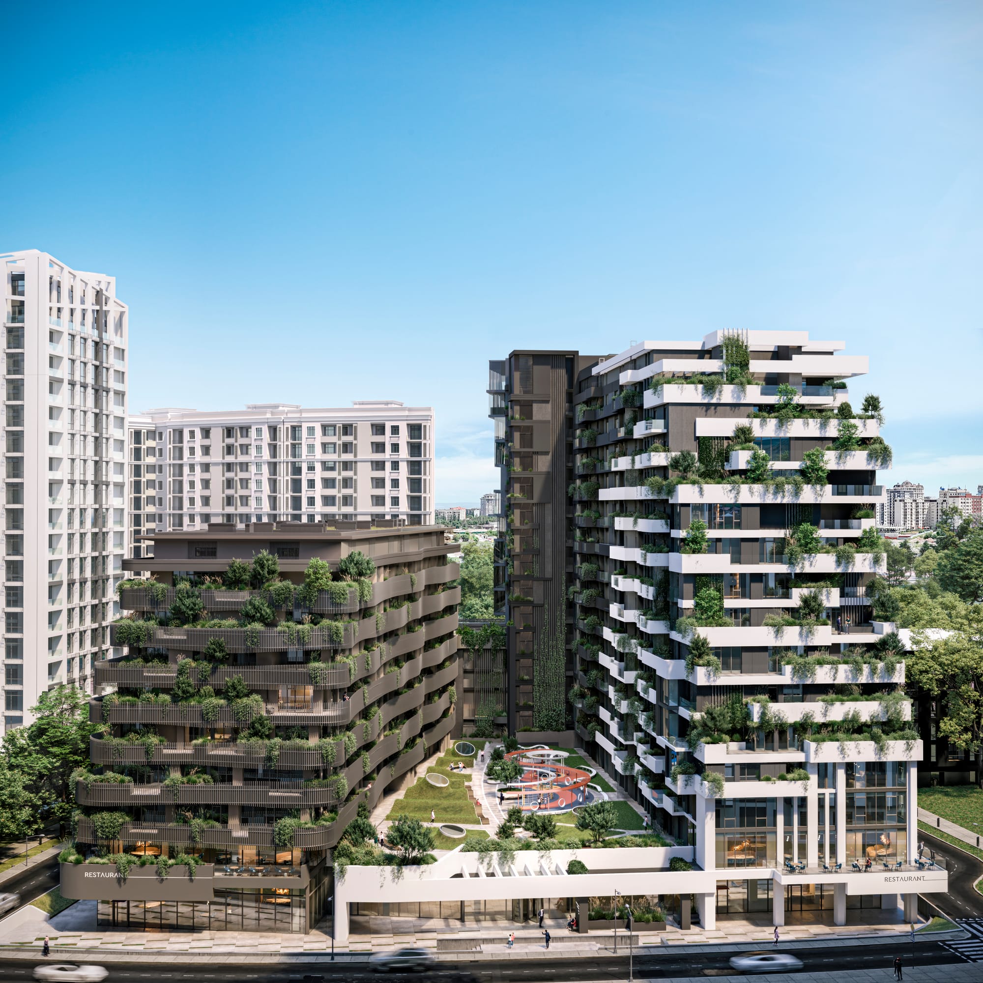 В Termeli эта идея получила собственное прочтение. Высотные и среднеэтажные корпуса расположены в шахматном порядке, чтобы сохранить панорамы на горы Ала-Тоо. Центральный двор поднят на уровень выше улицы, превращаясь в зеленую долину для жителей. В центре — соседский павильон, напоминающий по форме юрту: внутри пространство для встреч,отдыха и мероприятий.