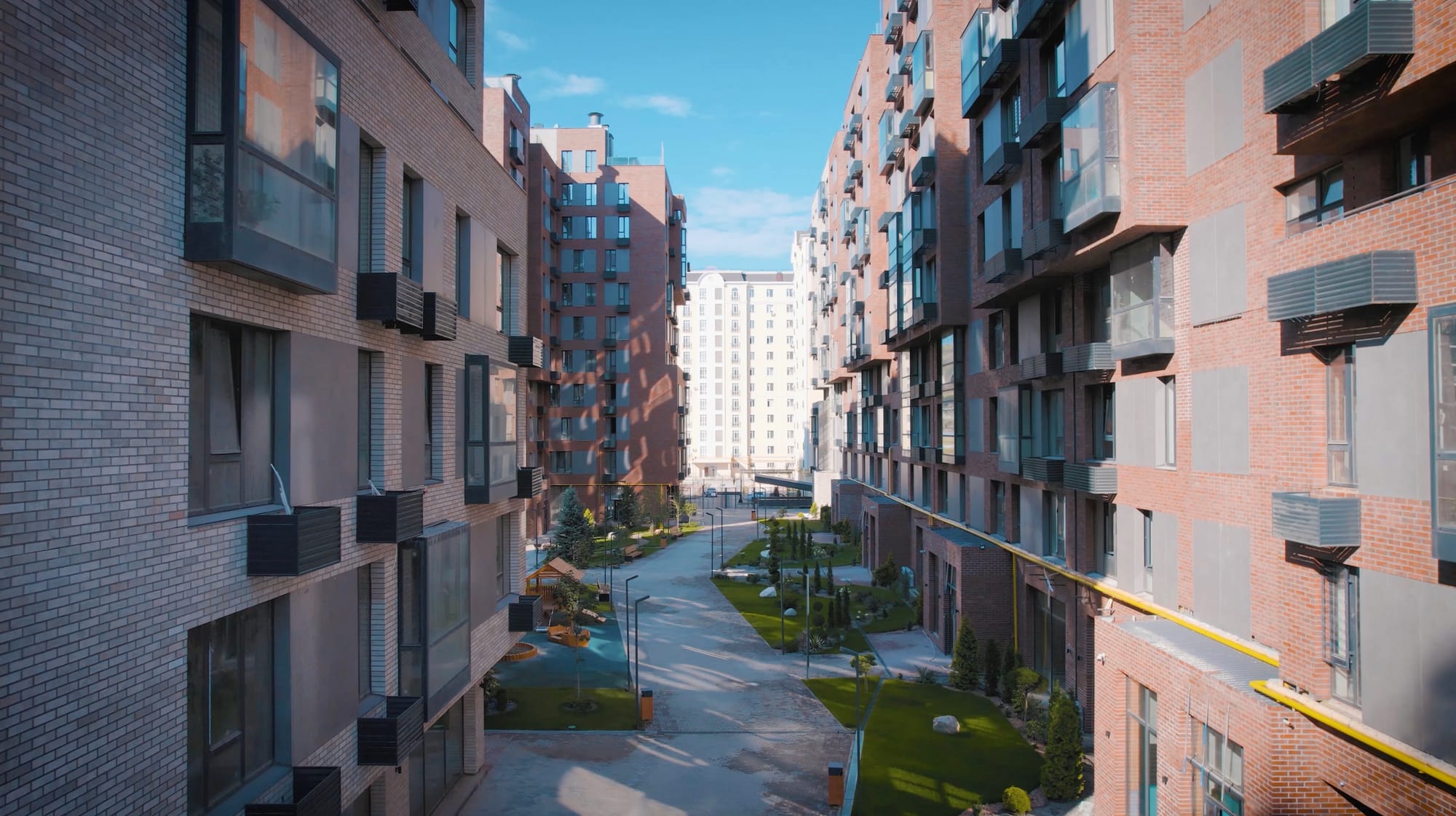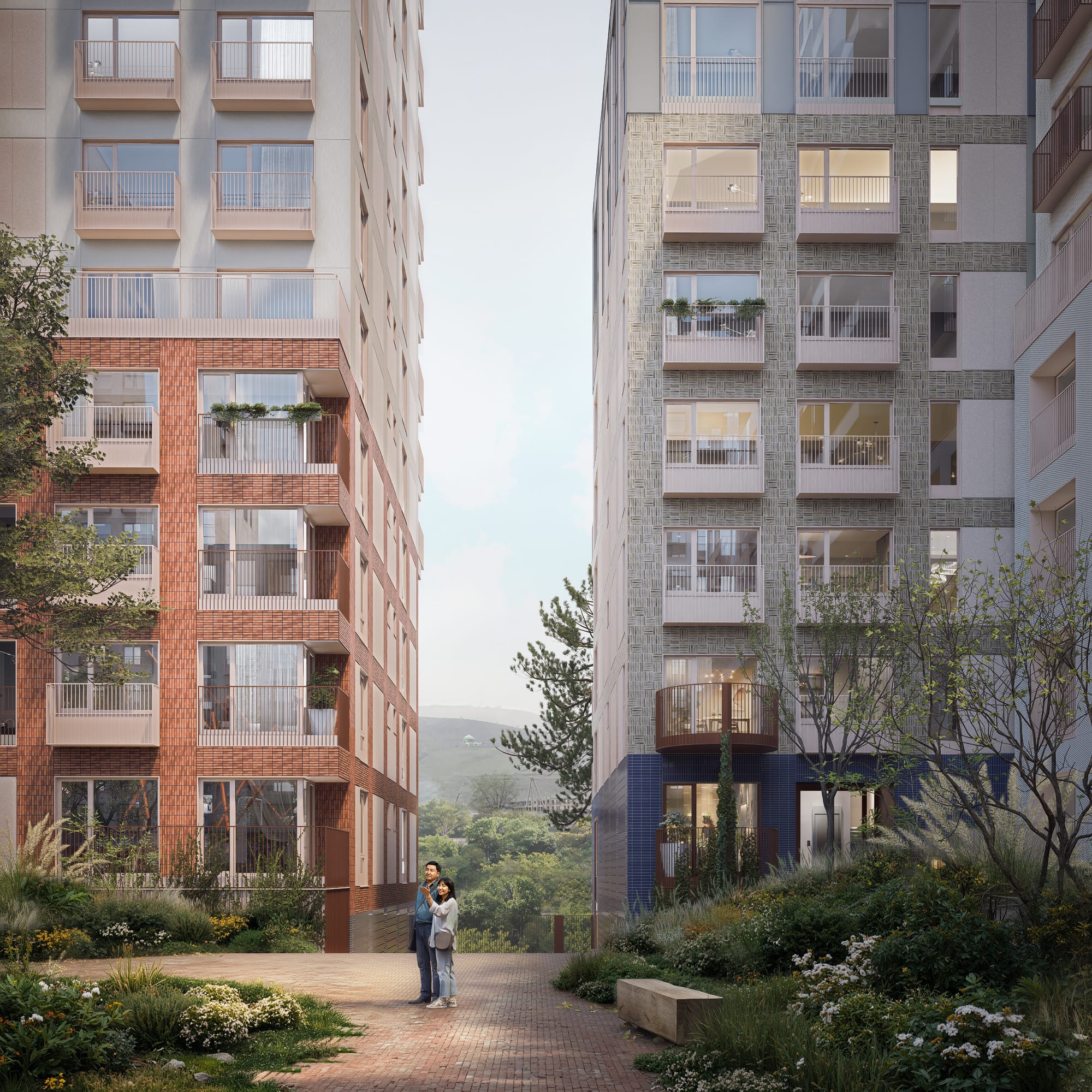 Сама архитектура работает с метафорой горной долины: здания по периметру — как горы, пентхаусы — снежные вершины, а двор — защищенная и живая долина.