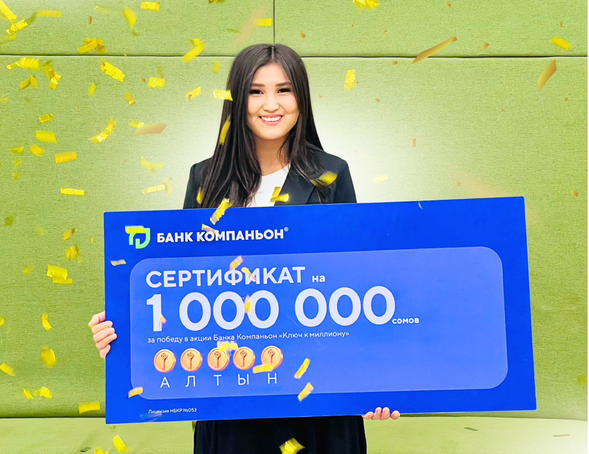 «Банк Компаньон» продолжает радовать клиентов крупными денежными призами. В рамках акции «Ключ к миллиону» золотой сундук с главным призом в 1 000 000 сомов открыла пользователь приложения «Компаньон» Киргилова Жазгүл Асанкуловна, став одной из счастливых победителей.
