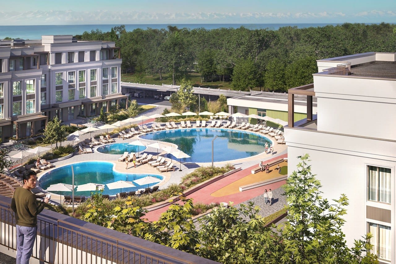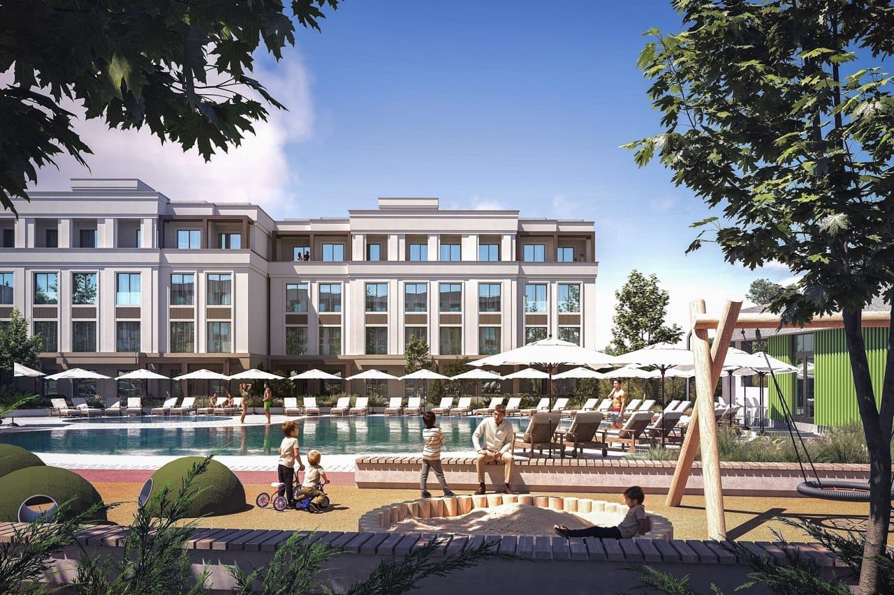 Инфраструктура квартала включает благоустроенный пляж с 200-метровым пирсом, три летних бассейна, круглогодичный SPA-центр с 25-метровым бассейном, четыре круглогодичных термальных бассейна под открытым небом, рестораны, кафе, коворкинг, спортивный кластер и полноценный детский комплекс KidZone. Территория полностью пешеходная, с системой контроля доступа.