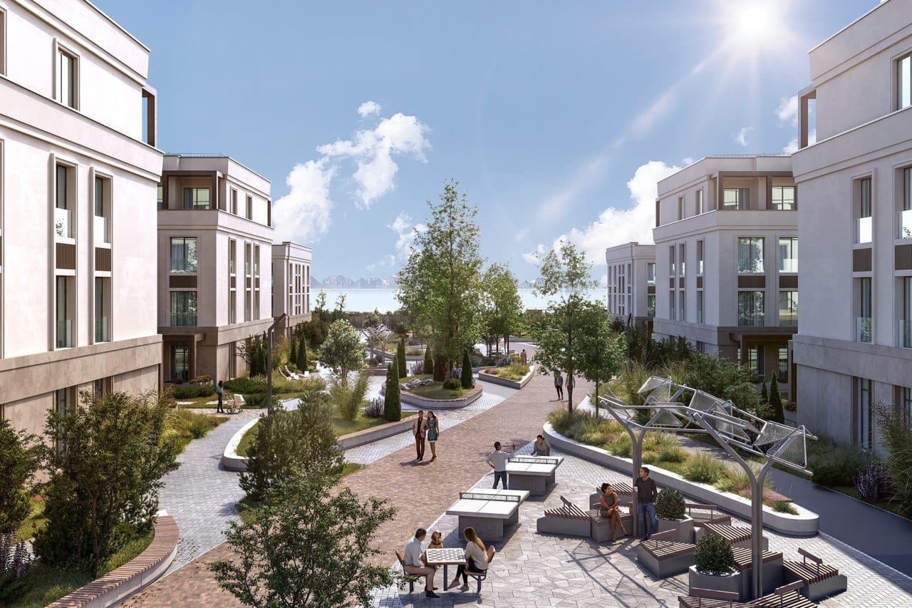 - формат: малоэтажная застройка (3–5 этажей), семь линий от верхней аллеи до парко-пляжной зоны;