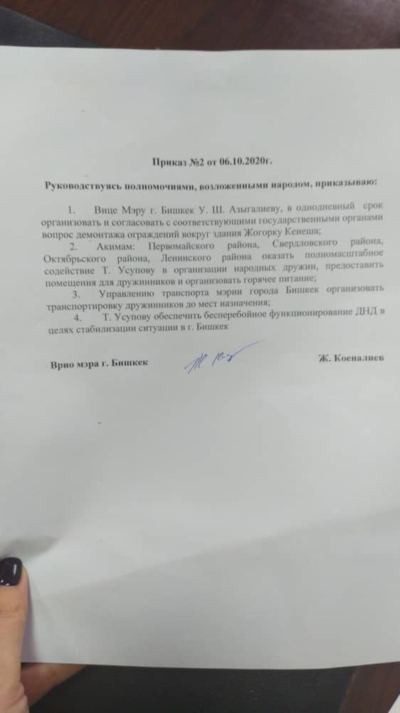 Самопровозглашенный мэр Бишкека Жоошбек Коеналиев поручил демонтировать забор вокруг «Белого дома». Об этом говорится в первом его приказе, передает 24.kg.