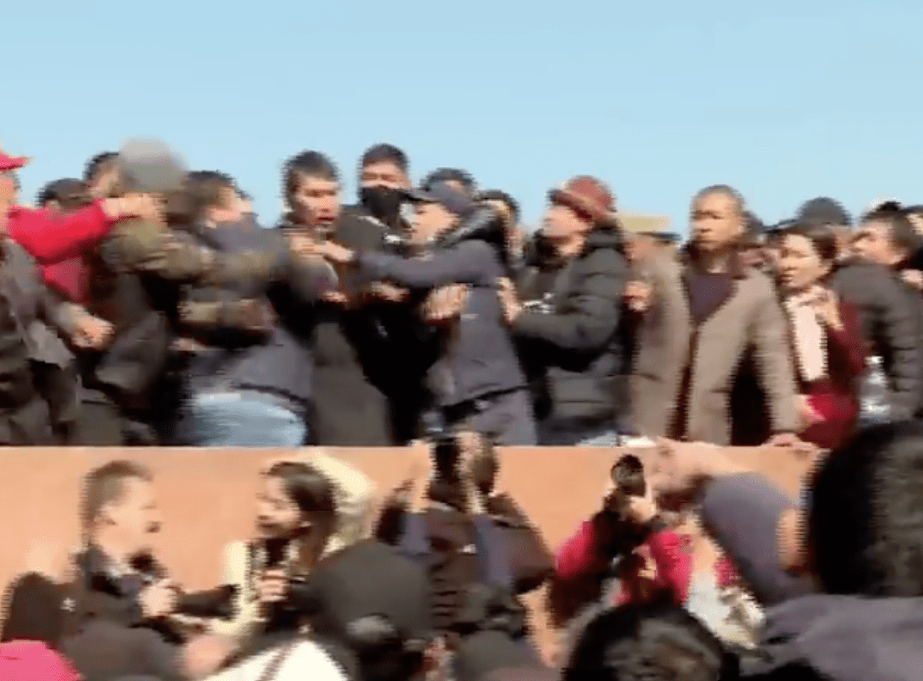Митингующие освистали Жээнчороева, в него также начали кидать разные предметы и ему пришлось уйти с трибуны. После этого на трибуне произошел конфликт.