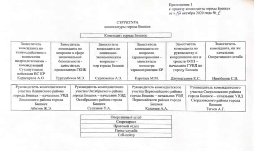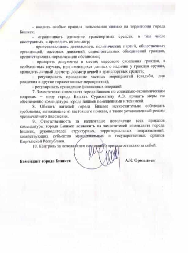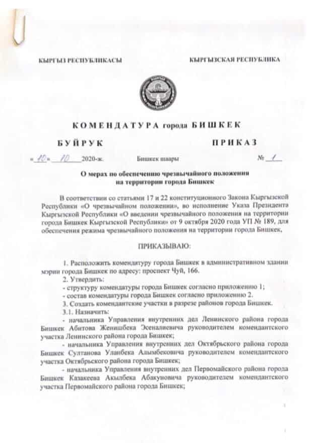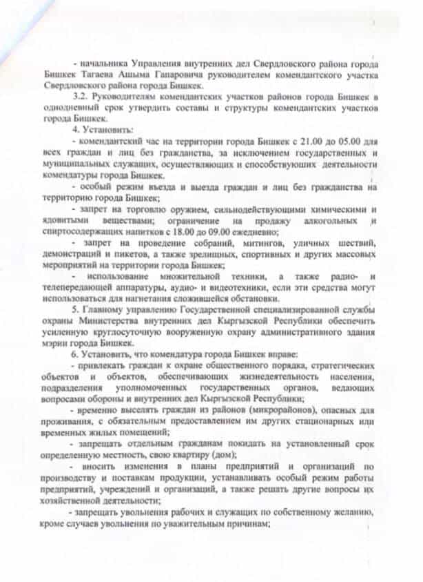В Бишкеке введен комендантский час с 21:00 до 5:00 часов. ПРИКАЗ