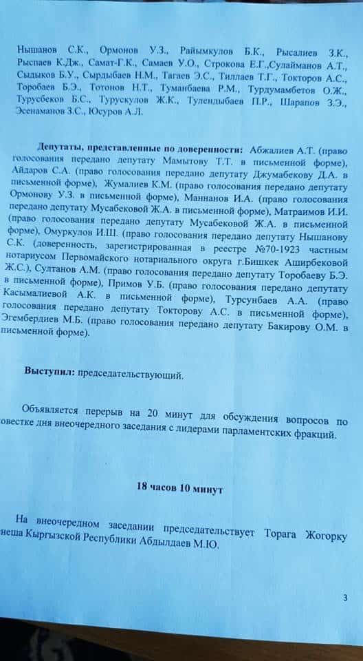 Глава пресс-службы ЖК КР также опубликовал на своей странице в Facebook список парламентариев, передавших доверенность коллегам.