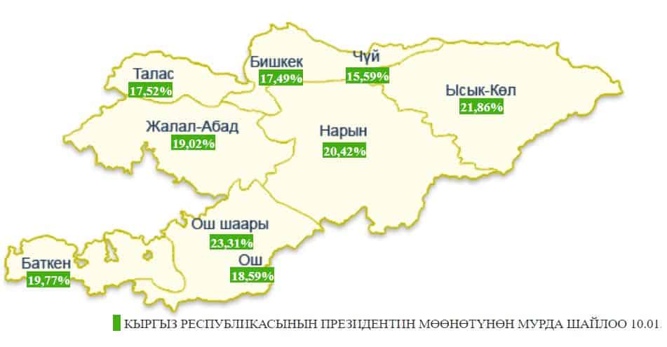 Самая высокая явка зафиксирована в Оше и Нарынской области, самая низкая — в Чуйской области.