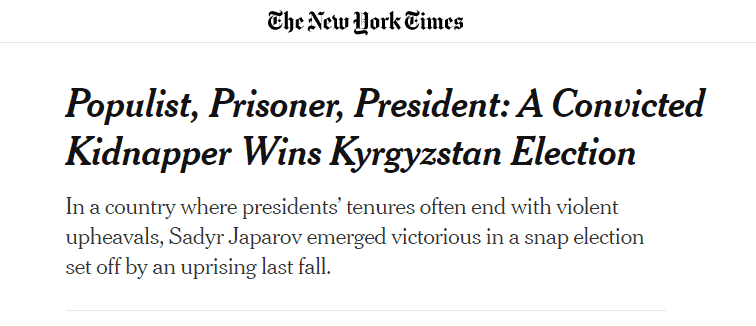 «В стране, где президентский срок часто заканчивается госпереворотами, Садыр Жапаров одержал победу на досрочных выборах, последовавших против акций протеста против предыдущей власти прошлой осенью. Политик-популист и осужденный похититель одержал уверенную победу в воскресенье на внеочередных президентских выборах в Кыргызстане», — говорится в новости.