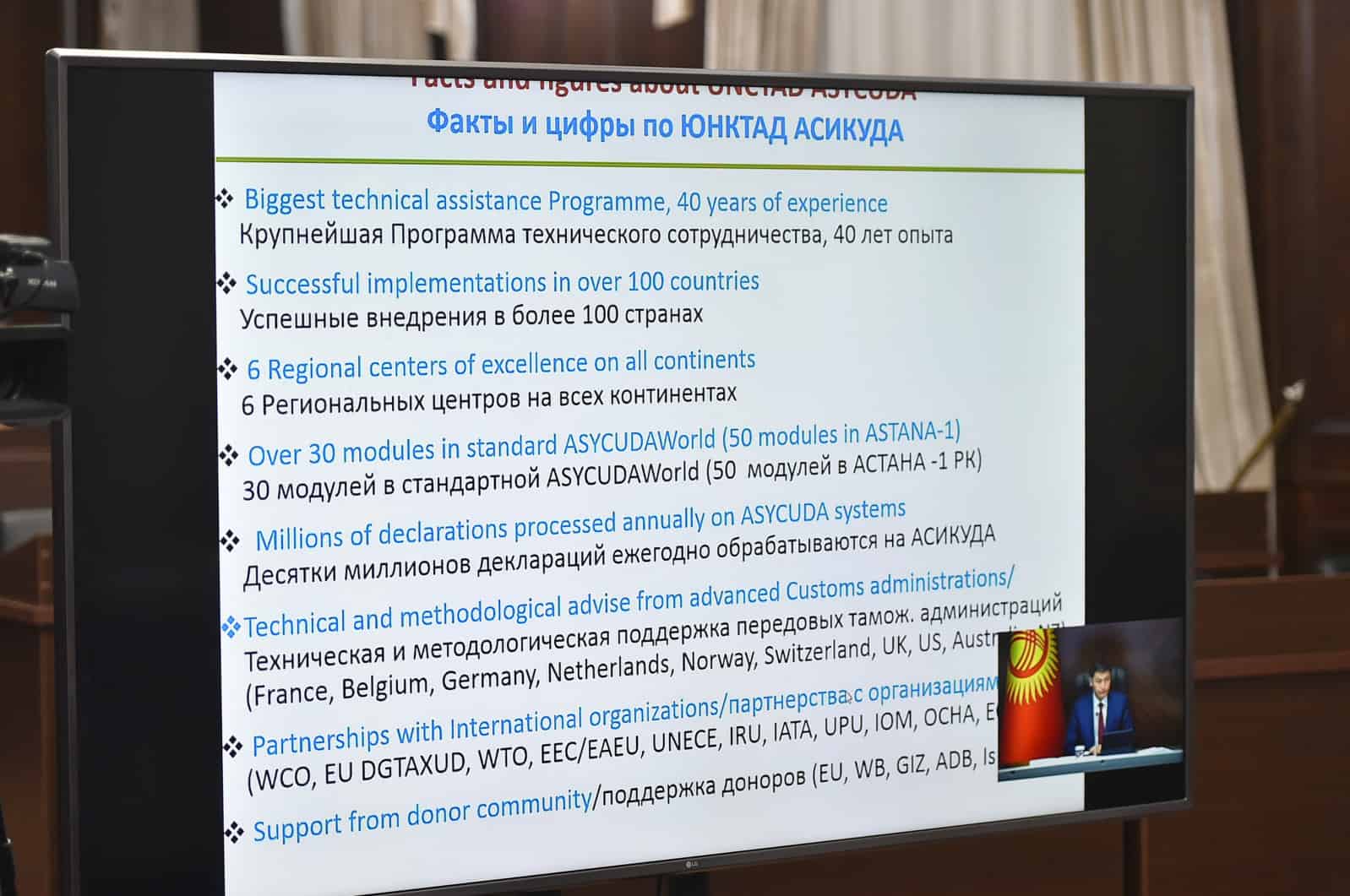 Правительство Кыргызстана надеется совместно с международной организацией «Конференция ООН по торговле и развитию» (ЮНКТАД) успешно реализовать проект по внедрению системы обработки таможенных данных ASYCUDA, которая должна улучшить администрирование таможенных процедур. Об этом заявил премьер-министр Улукбек Марипов на встрече по видеосвязи с и.о. генерального секретаря ЮНКТАД Изабель Дюранд.