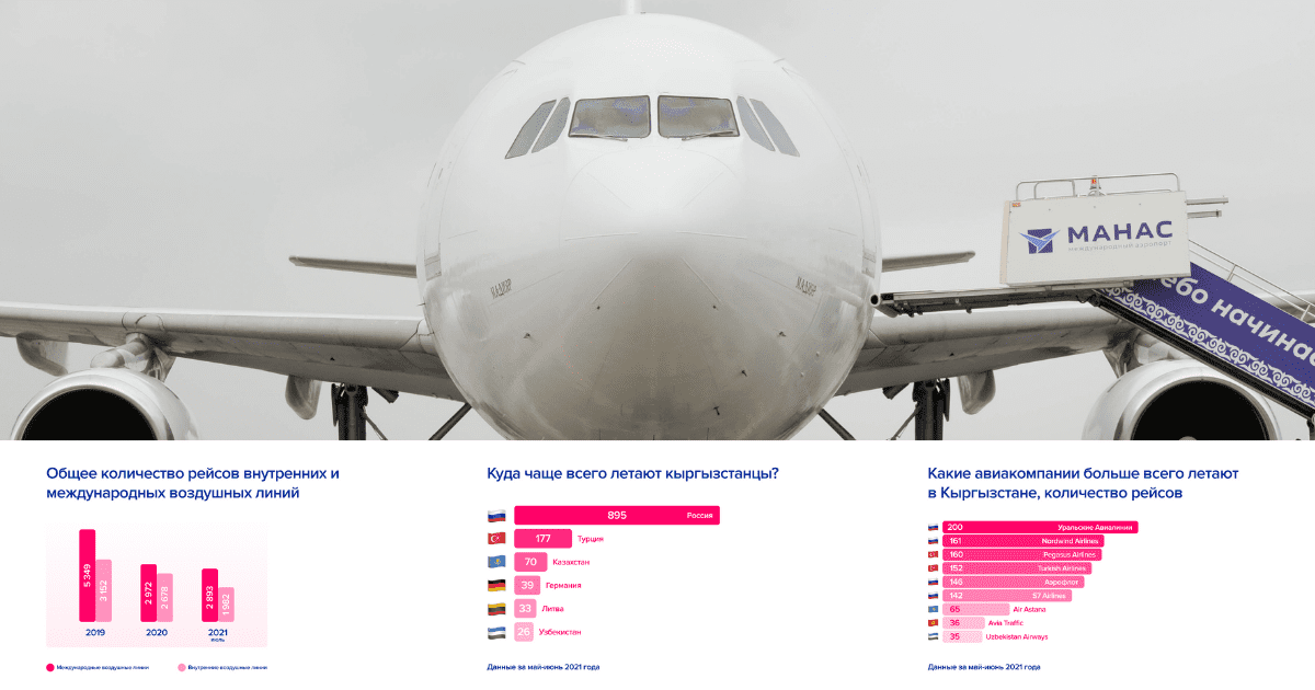 – Рынок, в целом, в прошлом году схлопнулся. Его не стало. Где-то месяца 3 вообще никаких авиаперелетов почти не было. Единственное – были чартерные рейсы, и то они специально организовывались для того, чтобы вывозить людей. Больше всего пострадали авиакомпании, которые были ориентированы на международную линию: Аэрофлот и т.д. Если посмотреть на перелеты внутри страны, оживление началось раньше, сначала запустились внутренние авиарейсы – Бишкек-Ош, в сниженном количестве. А потом начали подключаться и международные рейсы – Бишкек-Стамбул, Бишкек-Москва и так далее.