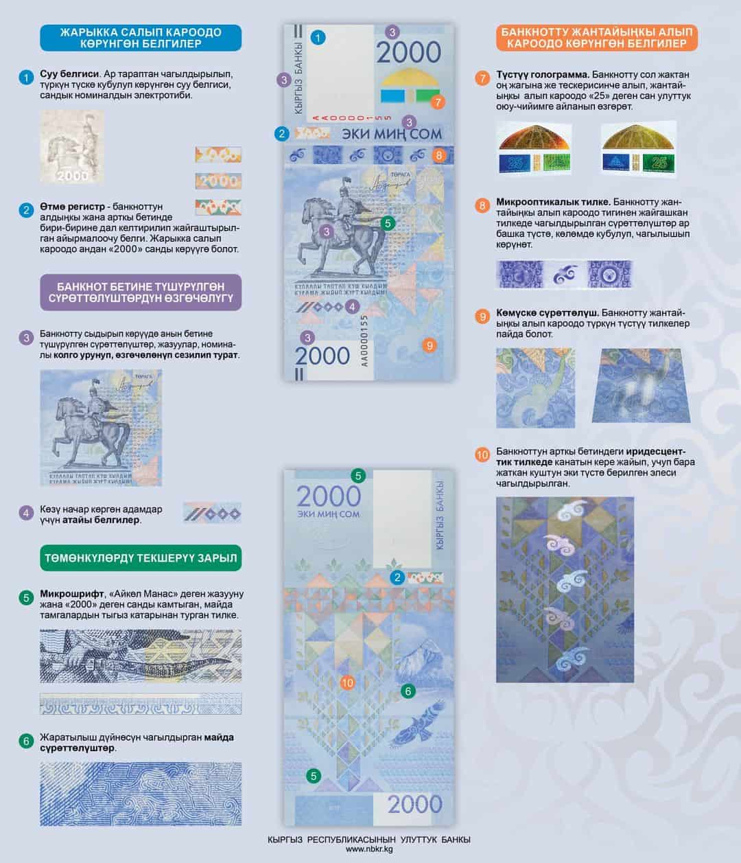 - Голограмма (только на банкноте номиналом 2000 сом). При наклоне банкноты слева направо изображение цифры «25» меняется на изображение национального узора, и наоборот.