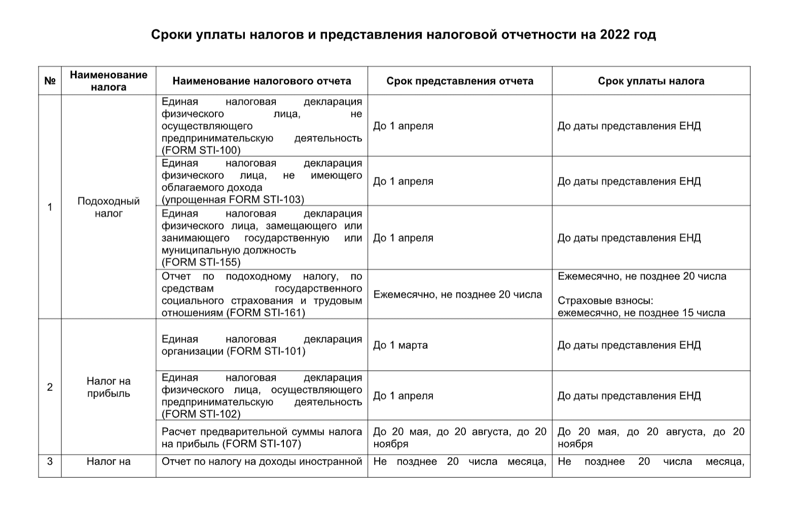 Календарь содержит сроки представления отчетности и уплаты 13 видов налогов, в том числе подоходного налога, налога на прибыль, НДС, акцизного налога и налога с продаж.