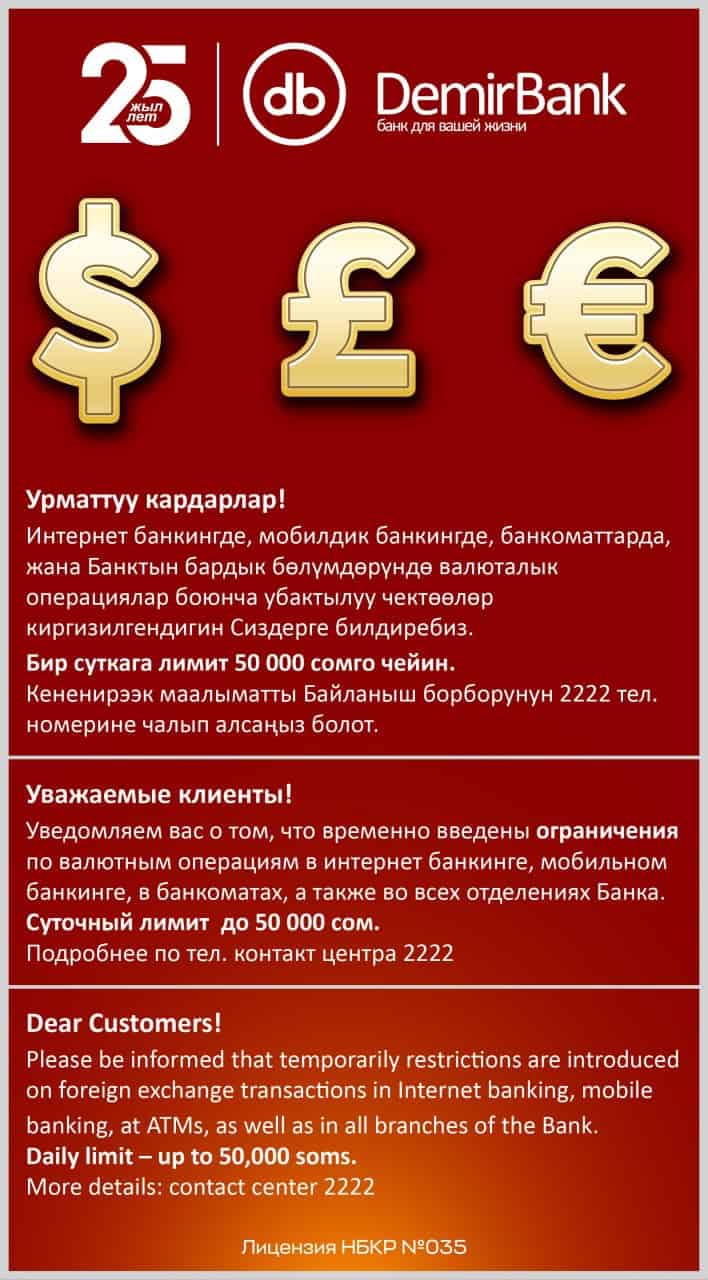 «Демир Кыргыз Интернэшнл Банк» ввел временные ограничения по валютным операциям. Такую рассылку получили клиенты банка.