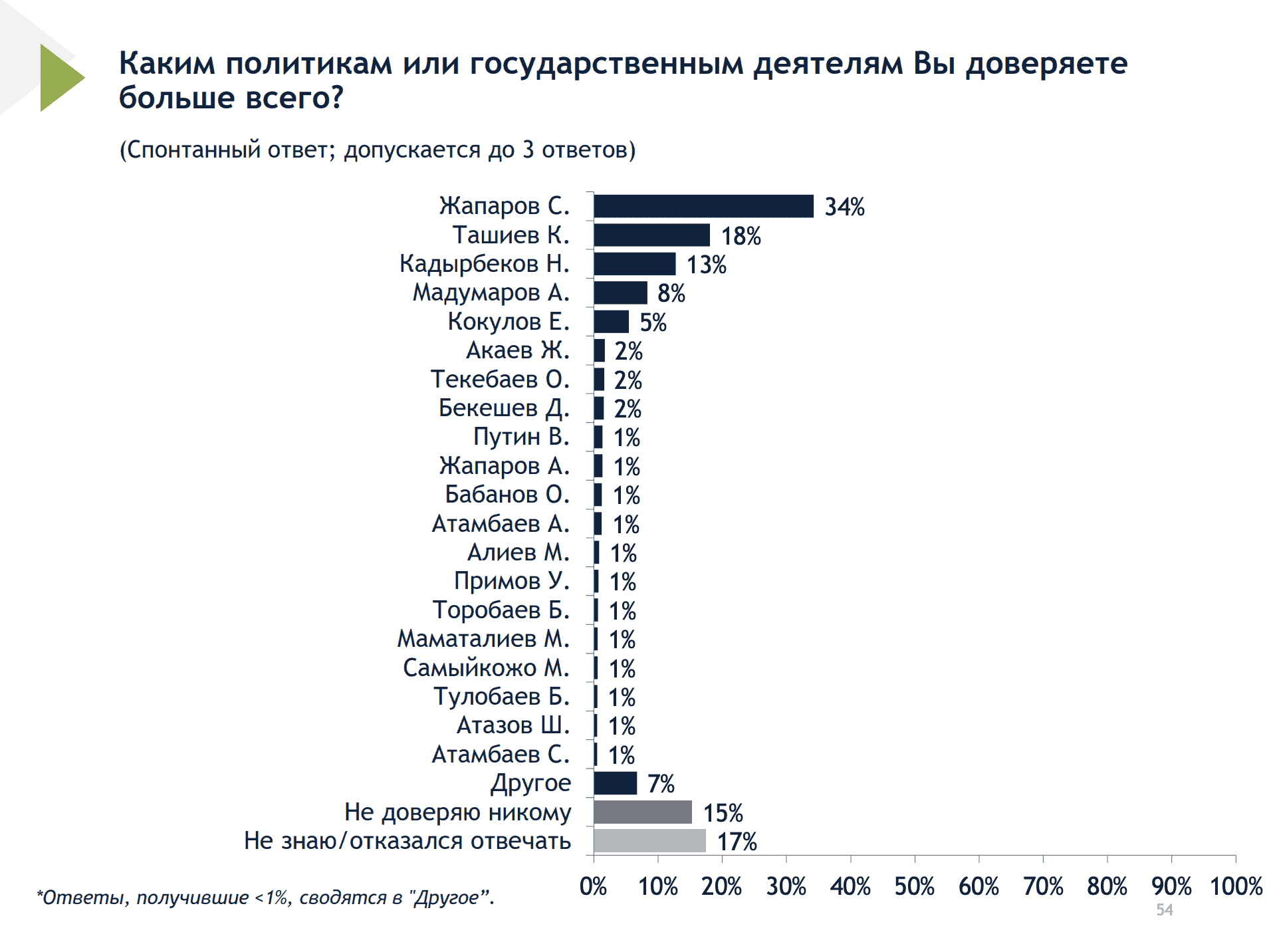 Далее идут зампредседателя кабмина — глава ГКНБ Камчыбек Ташиев (18%), лидер парламентской фракции «Ыйман Нуру» Нуржигит Кадырбеков (13%), лидер парламентской фракции «Бутун Кыргызстан» Адахан Мадумаров (8%) и депутат из фракции «Ынтымак» Эрлан Кокулов (5%). Жанар Акаев, Омурбек Текебаев, Дастан Бекешев набрали по 2%.