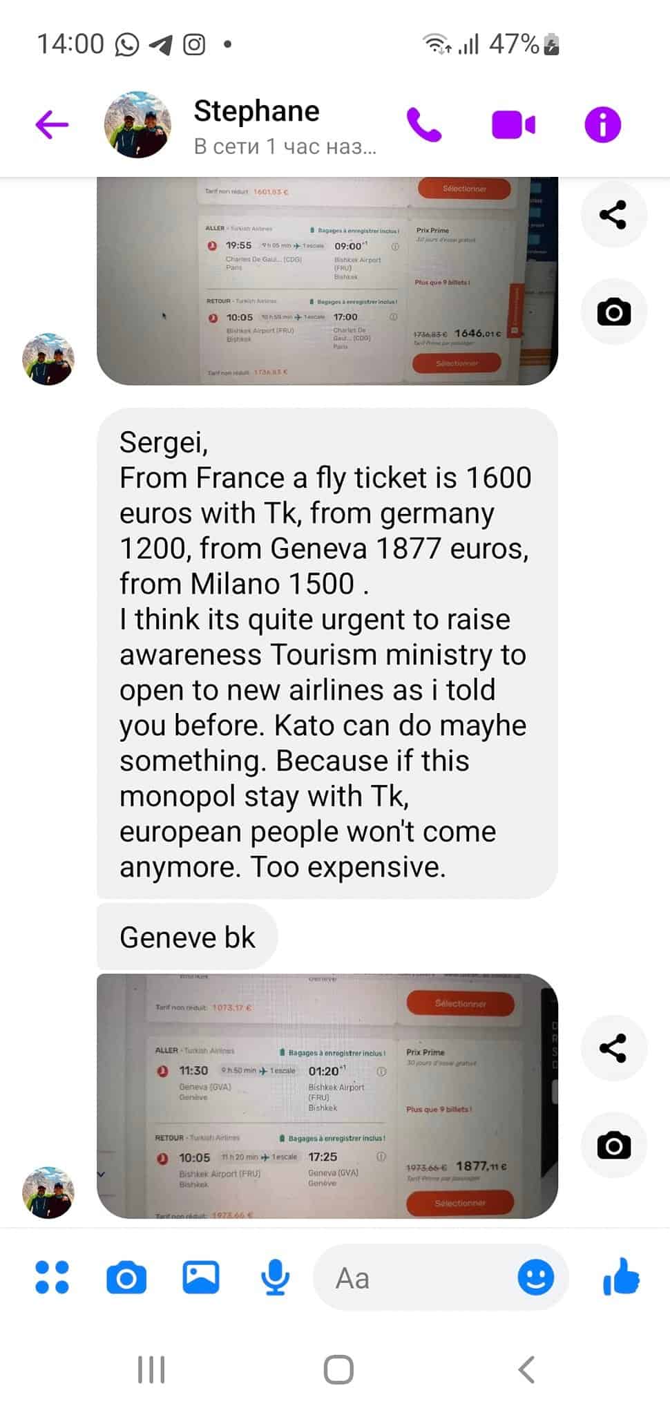 Он отметил, что перелет из Франции в Кыргызстан и обратно через Turksih Airlines стоит €1.6 тысячи, перелет Германия — Кыргызстан — Германия обойдется в €1.2 тысячи, из Женевы — €1.9 тысячи, из Милана — €1.5 тысячи.