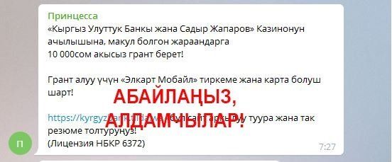 В соцсетях и мессенджерах активировались мошенники, распространяющие ложную информацию о выдаче грантов в размере 10 тысяч сомов всем, кто поддержал инициативу открытия казино. Об этом сегодня, 10 августа, сообщили в пресс-службе Нацбанка.