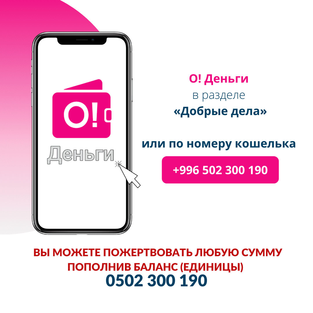 - О! Деньги — в разделе «Добрые дела» или по номеру кошелька +996 502 300 190;