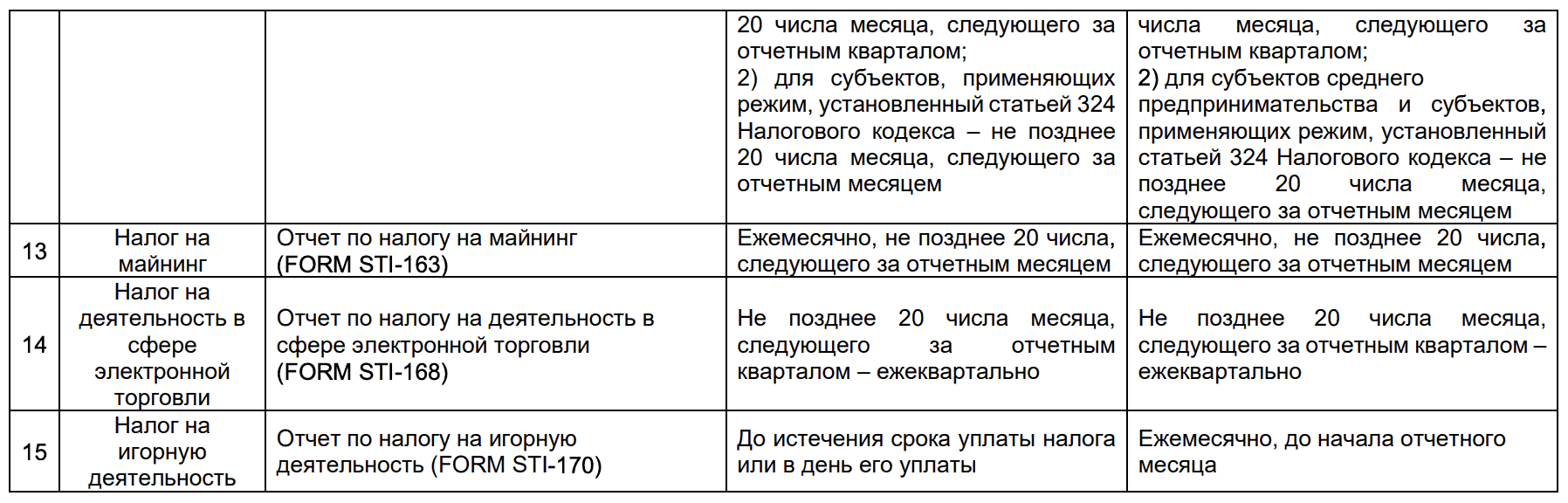 Срок представления отчета большинства налогов установлен на 1 апреля или 1 мая текущего года. По остальным видам налогов, сроки предоставления отчетов значатся до 20 числа каждого месяца либо месяца, следующего за отчетным кварталом.