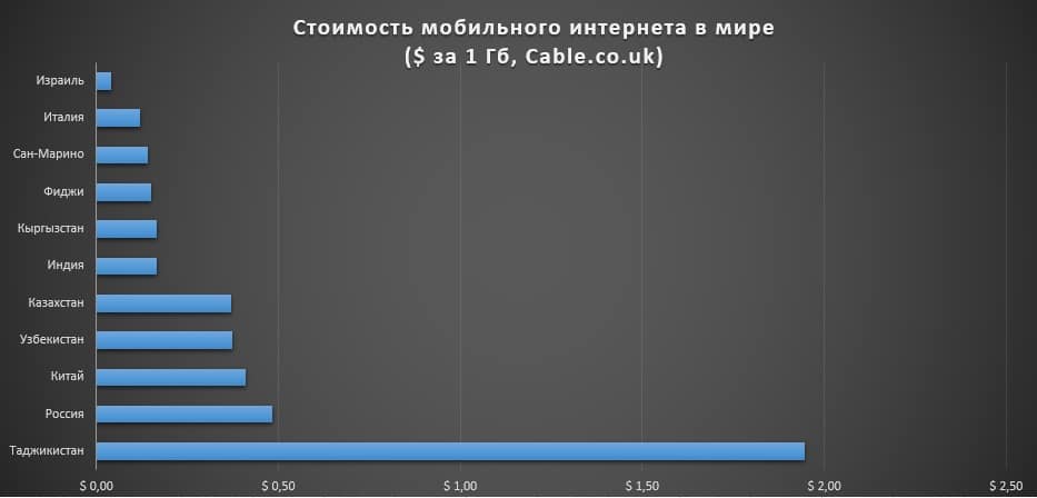 Самый дешевый в мире мобильный интернет — в Израиле. Передача 1 гигабайта данных там стоит всего четыре цента (в пересчета на доллары США). На втором месте — Италия (12 центов за гигабайт), на третьем — Сан-Марино (14 центов), на четвертом — Фиджи (15 центов). Пятое и шестое место поделили Кыргызстан и Индия — в обеих странах гигабайт интернета пользователям мобильников обходится в 17 центов.