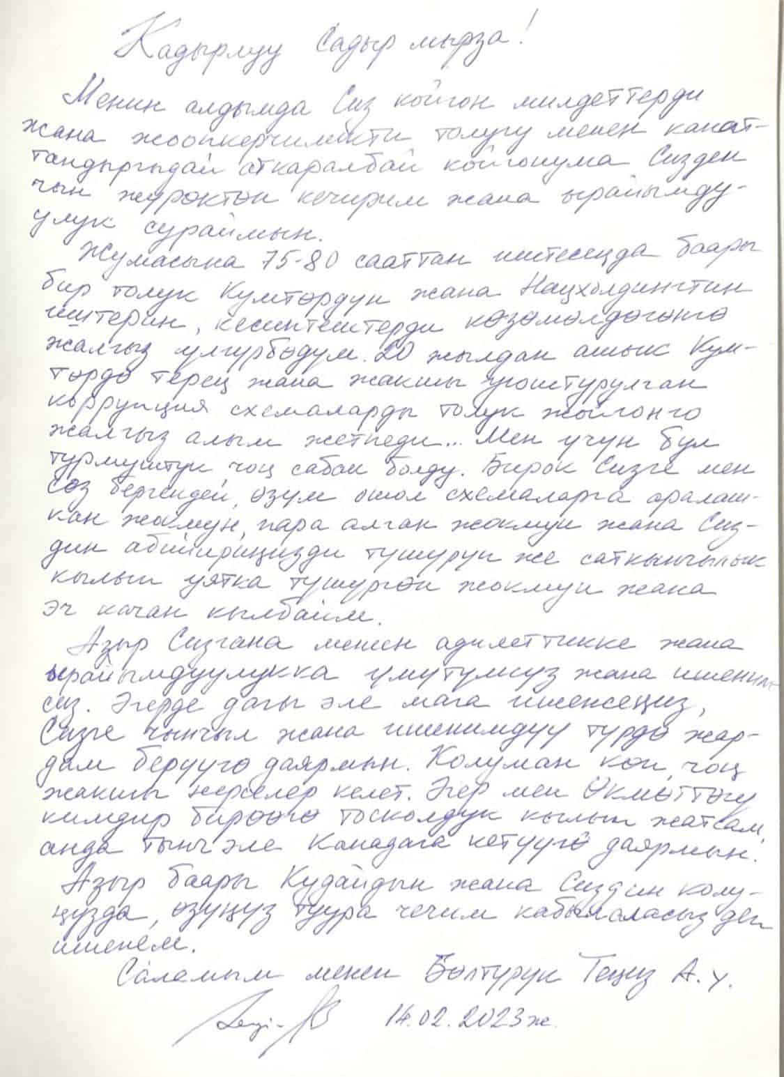 Адвокат бывшего внешнего управляющего компании «Кумтор голд компани» Тенгиза Болтурука Кайсын Абакиров написал открытое письмо президенту Садыру Жапарову. В нем сообщается, что две компании выплатили около 158 млн сомов по делу Болтурука.