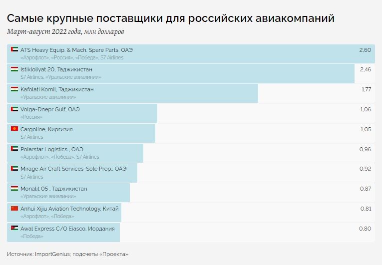Как сообщает издание, в рейтинг крупнейших поставщиков запчастей для российских самолетов также входят фирмы из ОАЭ, Таджикистана, Китая и Иордании. Журналисты-расследователи основывают свои выводы на статистике коммерческого агрегатора таможенных данных Import Genius. Агрегатор собирал информацию о таможенных операциях России до августа 2022 года.