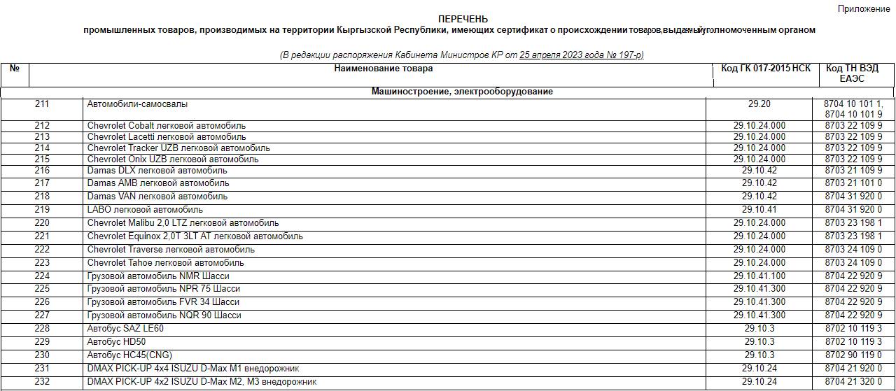 Преференции, о которых сообщает Минэконом, - не что иное как разрешение госпредприятиям, в которых государству принадлежит 50% и более, а также их дочерним структурам, напрямую покупать товары у отечественных производителей путем заключения договора. В перечень разрешенных к прямой закупке входит 322 товара. Все они должны быть произведены в Кыргызстане. Товары объединены в десять групп. В группе товаров «Машиностроение и электрооборудование» перечислена 21 марка автомобилей из модельного ряда предприятия Chevrolet в Узбекистане.