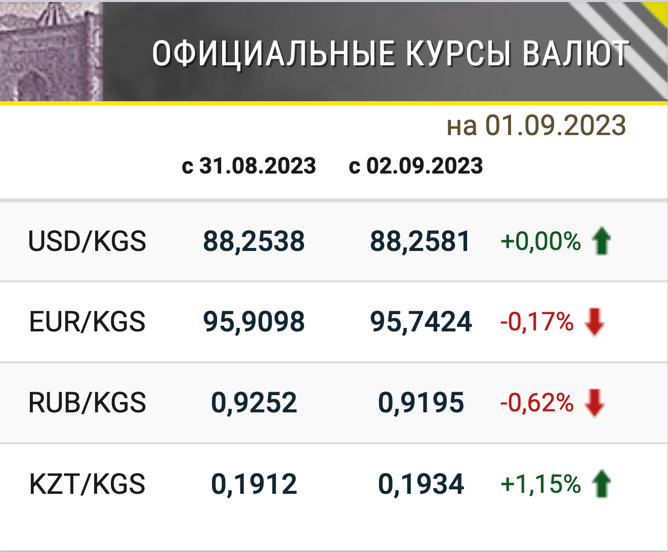 Нацбанк определил официальные курсы иностранных валют к сому, которые будут действовать со 2 сентября. Согласно представленным данным, по отношению к сому повысился курс казахстанского тенге.