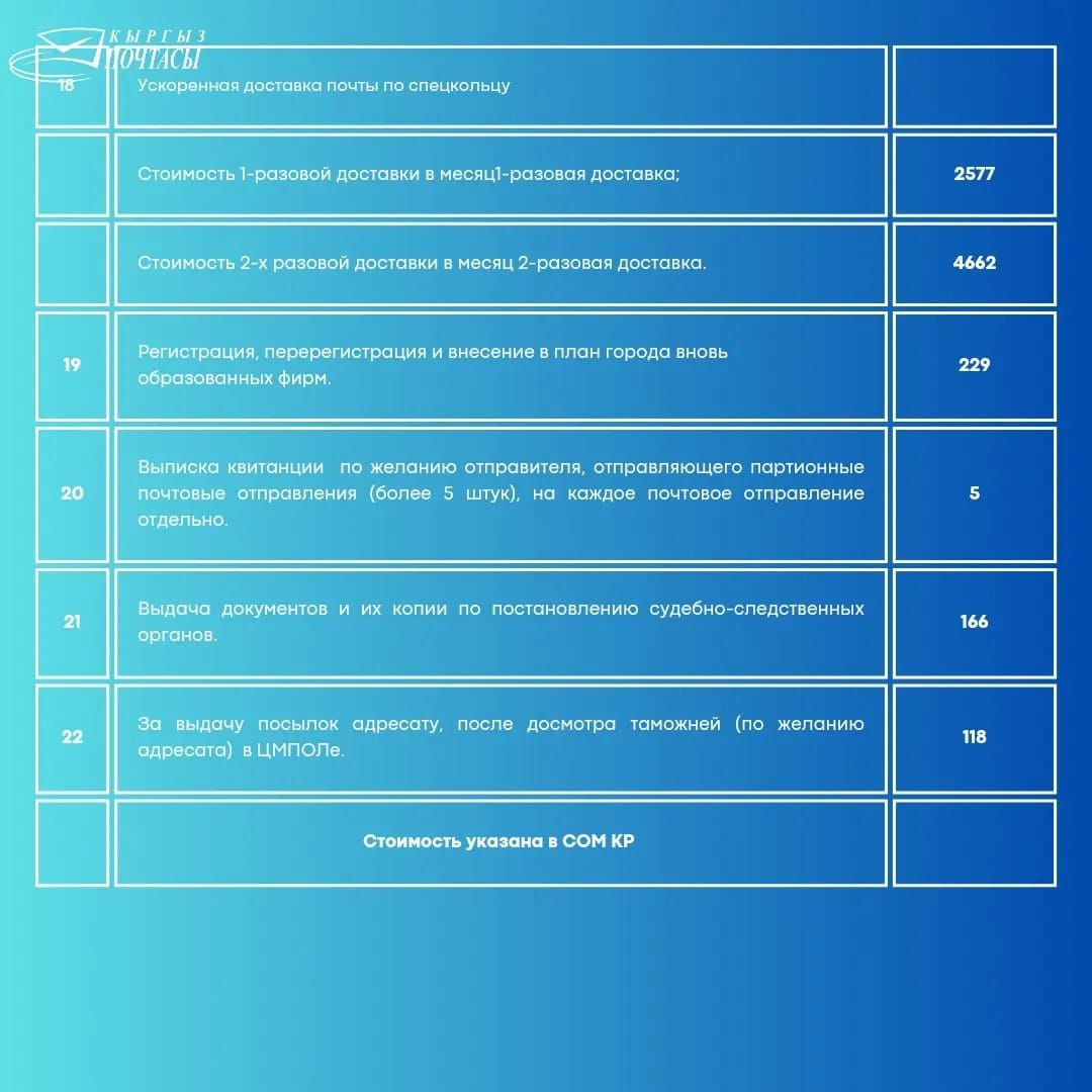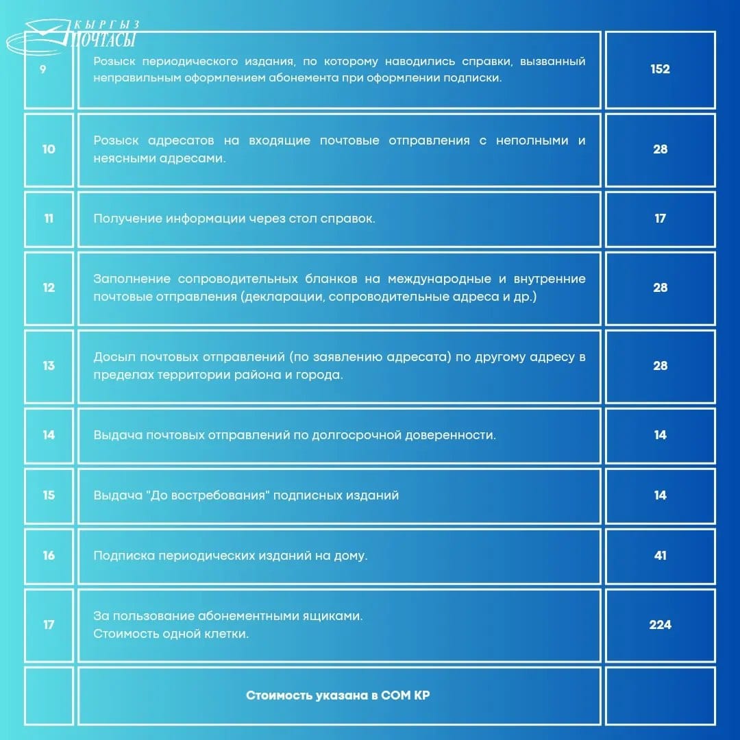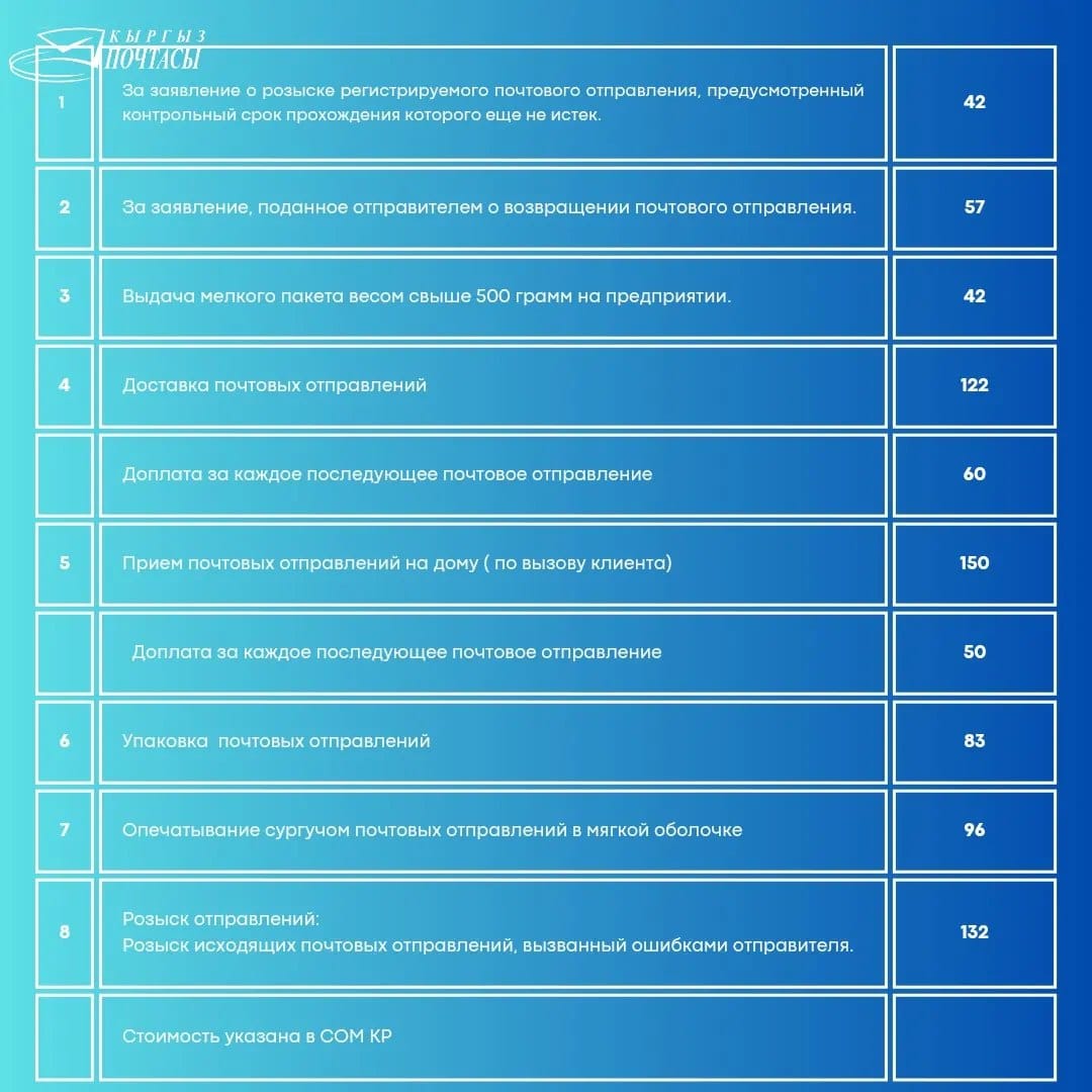 С перечнем изменений можно ознакомиться ниже либо на сайте ОАО "Кыргыз почтасы".