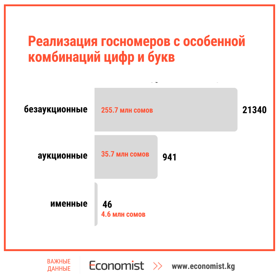 За 11 месяцев 2023 года изготовлено 115 тысяч водительских удостоверений. Сумма полученного дохода составила 34.6 млн сомов. Кроме того, суммарно изготовлено 652 тысячи номерных знаков на сумму 382 млн сомов. Из них госномера с особенной комбинаций цифр и букв за 11 месяцев 2023 года: