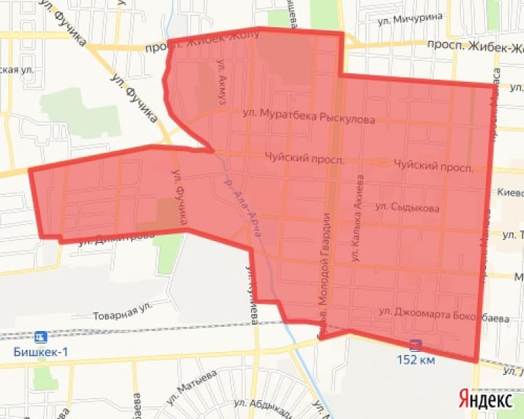- проспект Д. Сяопина – реку Ала-Арча – улицу Боконбаева – улица Кулиева – улица Московскую – улица Фучика – улица Казакова.