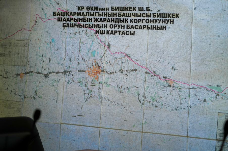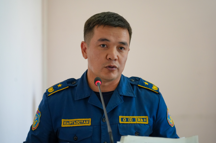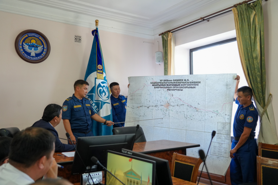 Замначальника управления МЧС по Бишкеку Алтынбек Тухтаров информировал о текущей ситуации в ущелье Ала-Арча, включая озеро Адыгене, и продемонстрировал на карте потенциально опасные объекты для возможного подтопления.