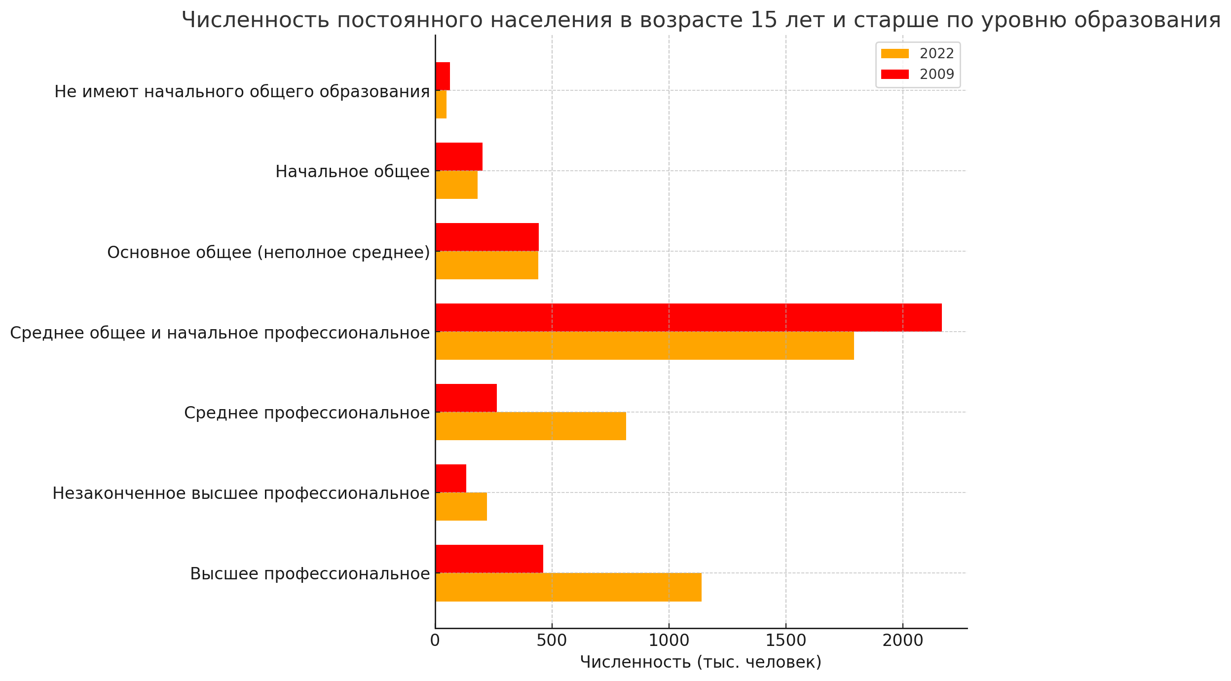 Число людей с начальным общим образованием также сократилось: в 2009 году их было 203.7 тысячи человек, а к 2022-му показатель уменьшился до 182.2 тысячи. Доля населения, не имеющего начального общего образования, уменьшилась с 63.8 тысячи человек до 49.1 тысячи человек.