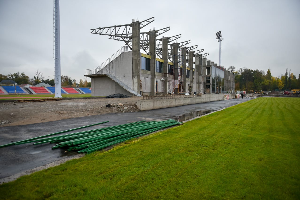 Завершается монтаж ограждений: с восточной и западной сторон установлены ограждения из песчаника, а с северной – габион. Также выкопан котлован под здание физкультурно-оздоровительного комплекса, ведутся бетонные работы по конструкциям восточной и западной трибун.