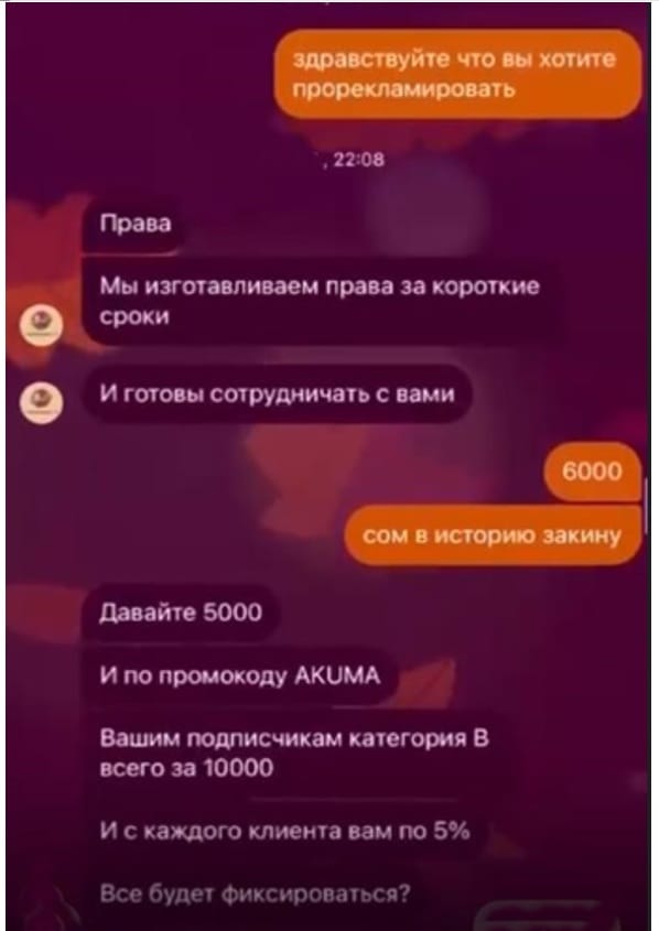 Сотрудники ГУУР МВД установили владельца аккаунта в Telegram, распространявшего сообщения об услугах по выдаче водительских удостоверений. Им оказался гражданин Т.у.У. 2005 года рождения, житель Чуйской области, студент одного из столичных вузов. Его доставили в следственную службу УВД Ленинского района для проведения следственных действий.