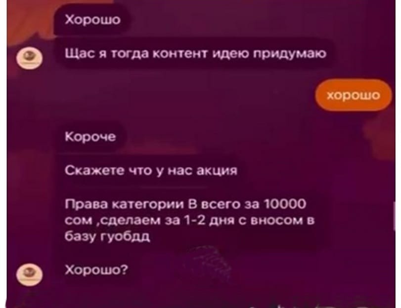 В дальнейшем было зафиксировано, что рекламу весьма подозрительной услуги распространяют и другие пользователи соцсетей. Одной из таких личностей оказалась гражданка 2007 года рождения, проживающая в Бишкеке. Ее доставили в следственные органы, после чего девушка сообщила, что ей платили за рекламу публикаций.