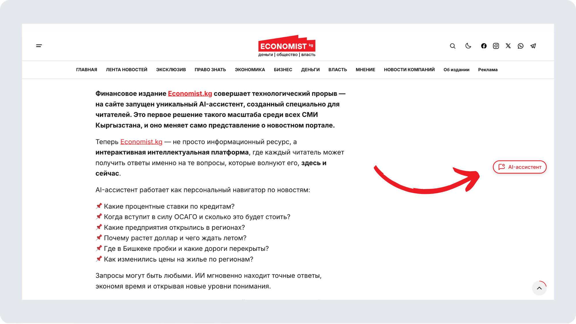 По словам главного редактора Economist.kg Ивана Дониса, запуск AI-ассистента — это ответ на главный вызов современного медиа: быть не просто актуальным, а максимально полезным в любой момент времени.