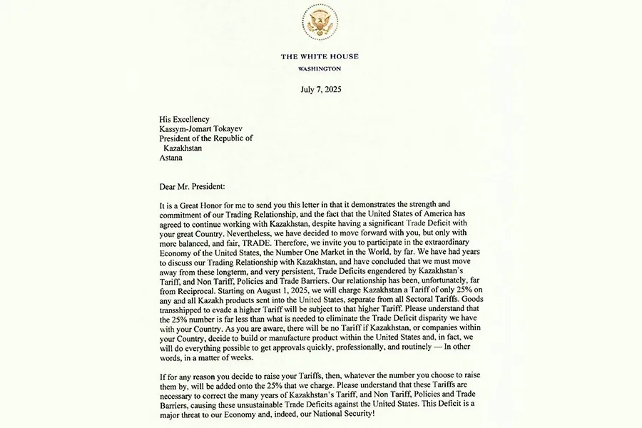 «Начиная с 1 августа 2025 года мы будем взимать с Казахстана пошлину в размере всего 25 процентов на любые и все казахстанские товары, направляемые в Соединенные Штаты, отдельно от всех секторальных пошлин», - говорится в документе.