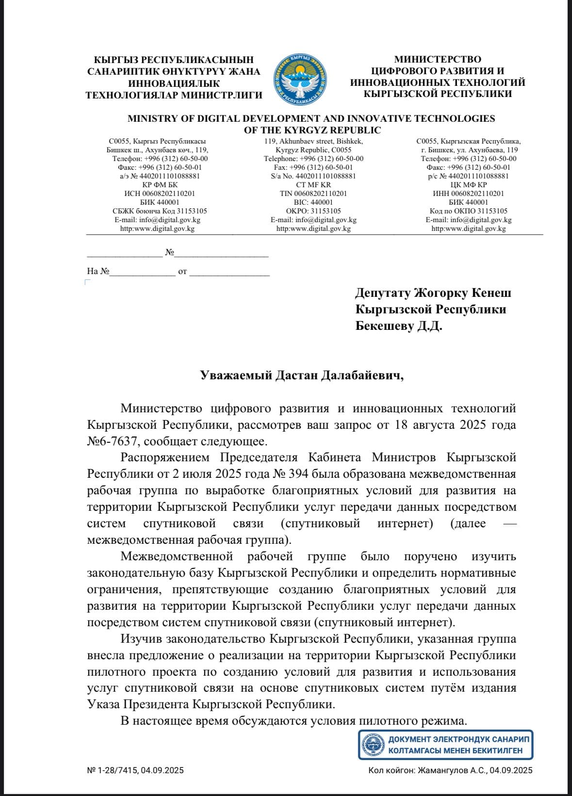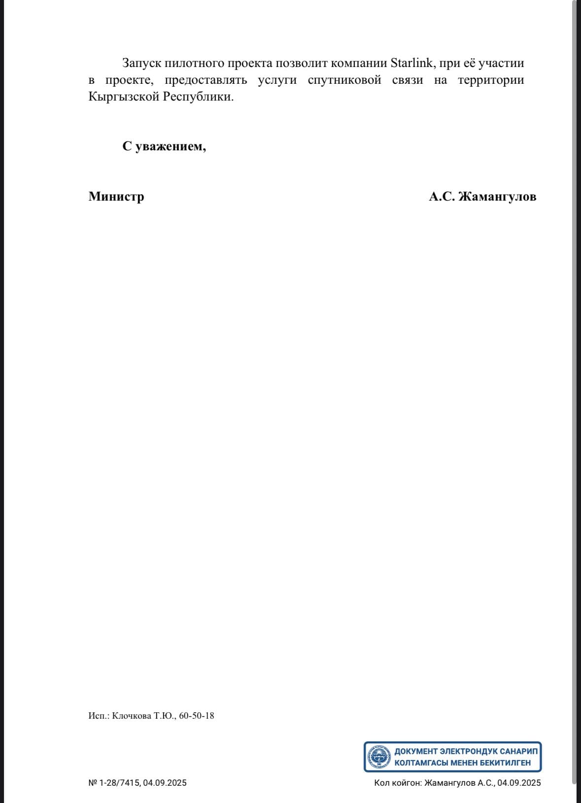 «Распоряжением председателя кабинета министров от 2 июля 2025 года №394 была образована межведомственная рабочая группа по выработке условий для развития на территории Кыргызстана услуг передачи данных посредством систем спутниковой связи. В настоящее время обсуждаются условия пилотного режима», — говорится в документе.