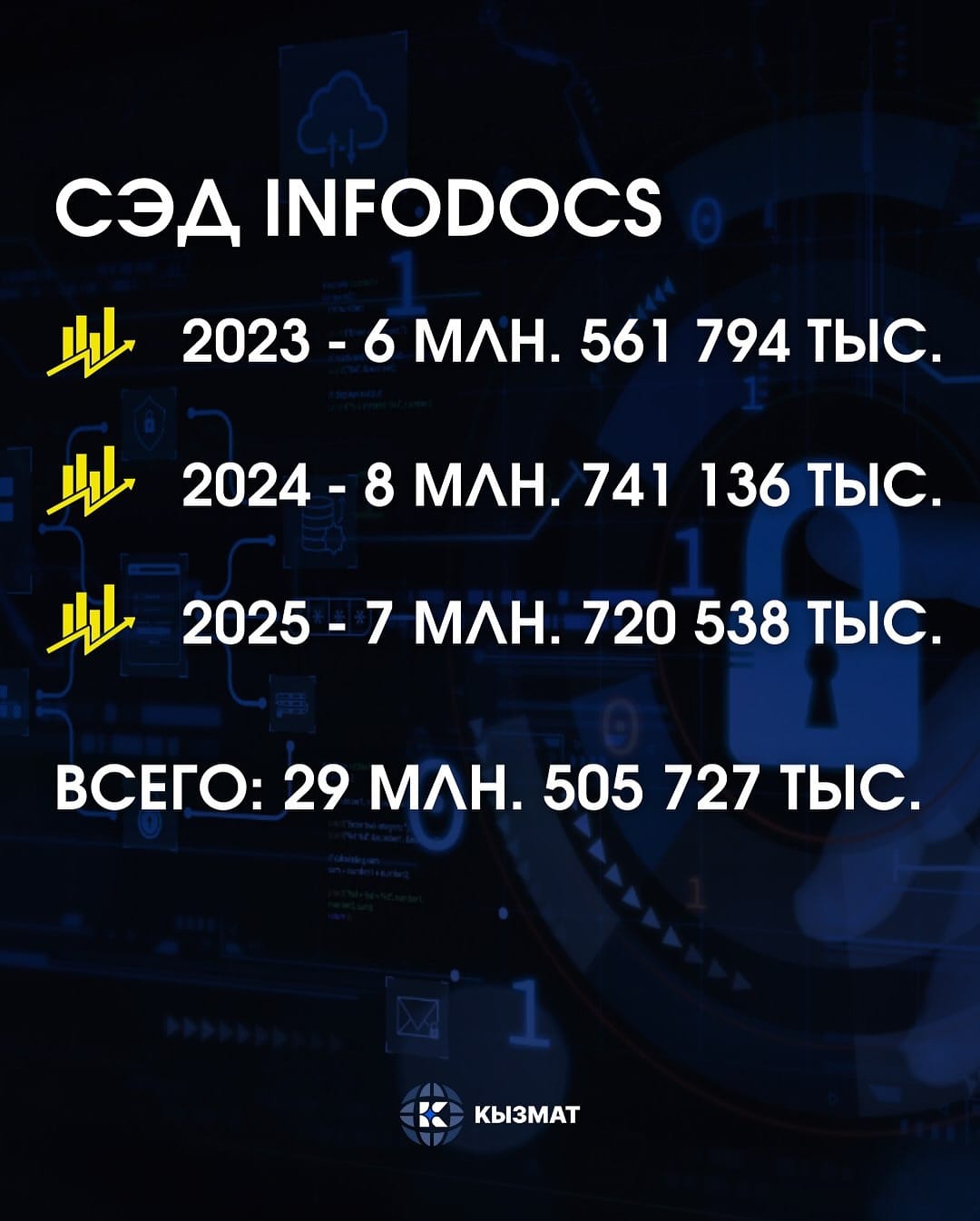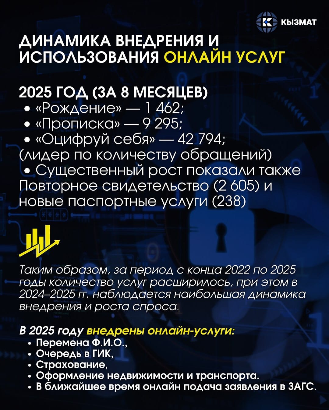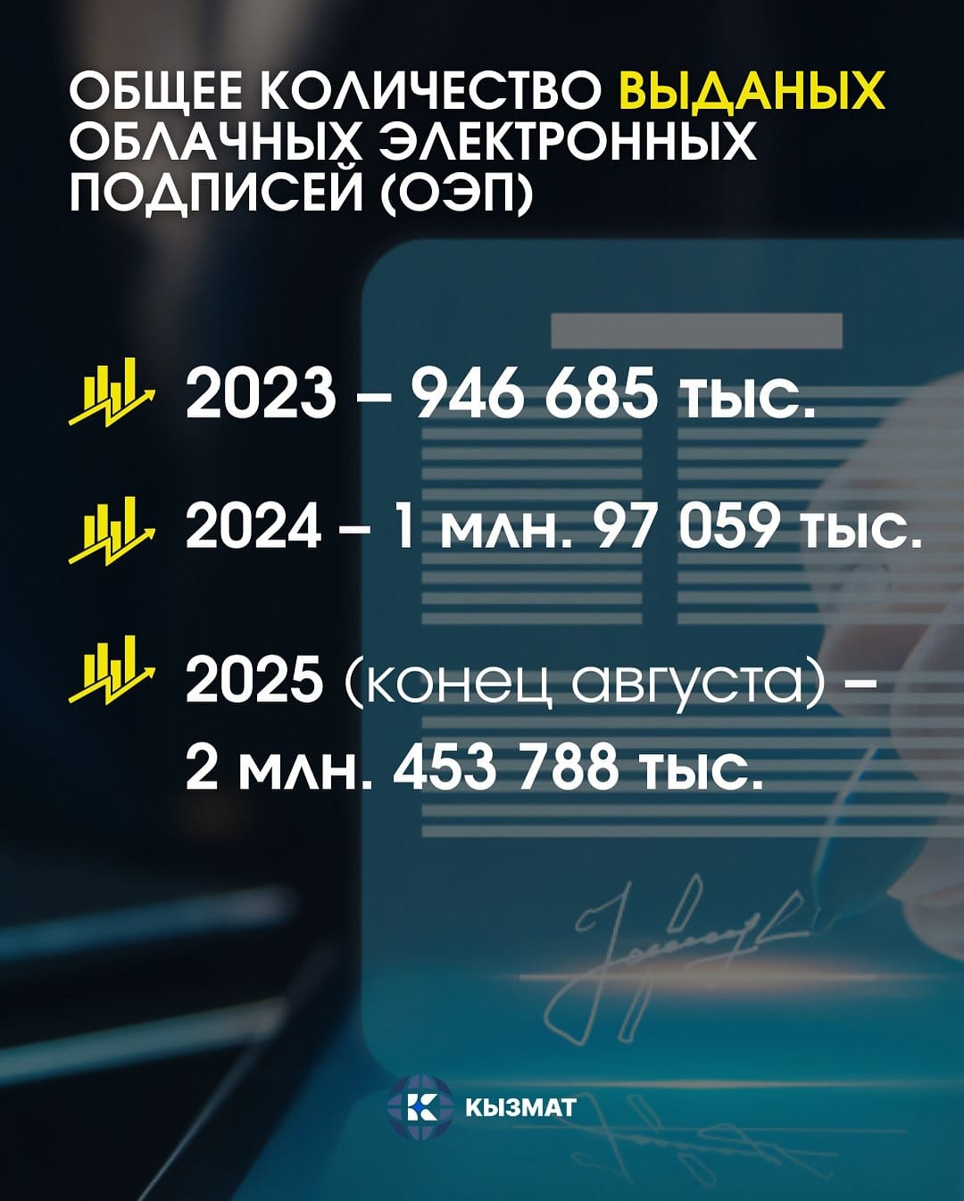 ГУ «Кызмат» при Управлении делами президента КР фиксирует резкий рост использования цифровых госуслуг. По данным ведомства, количество облачных ЭЦП увеличилось почти в 2.5 раза: с 946 тысяч в 2023 году до 2.45 млн на август 2025 года.