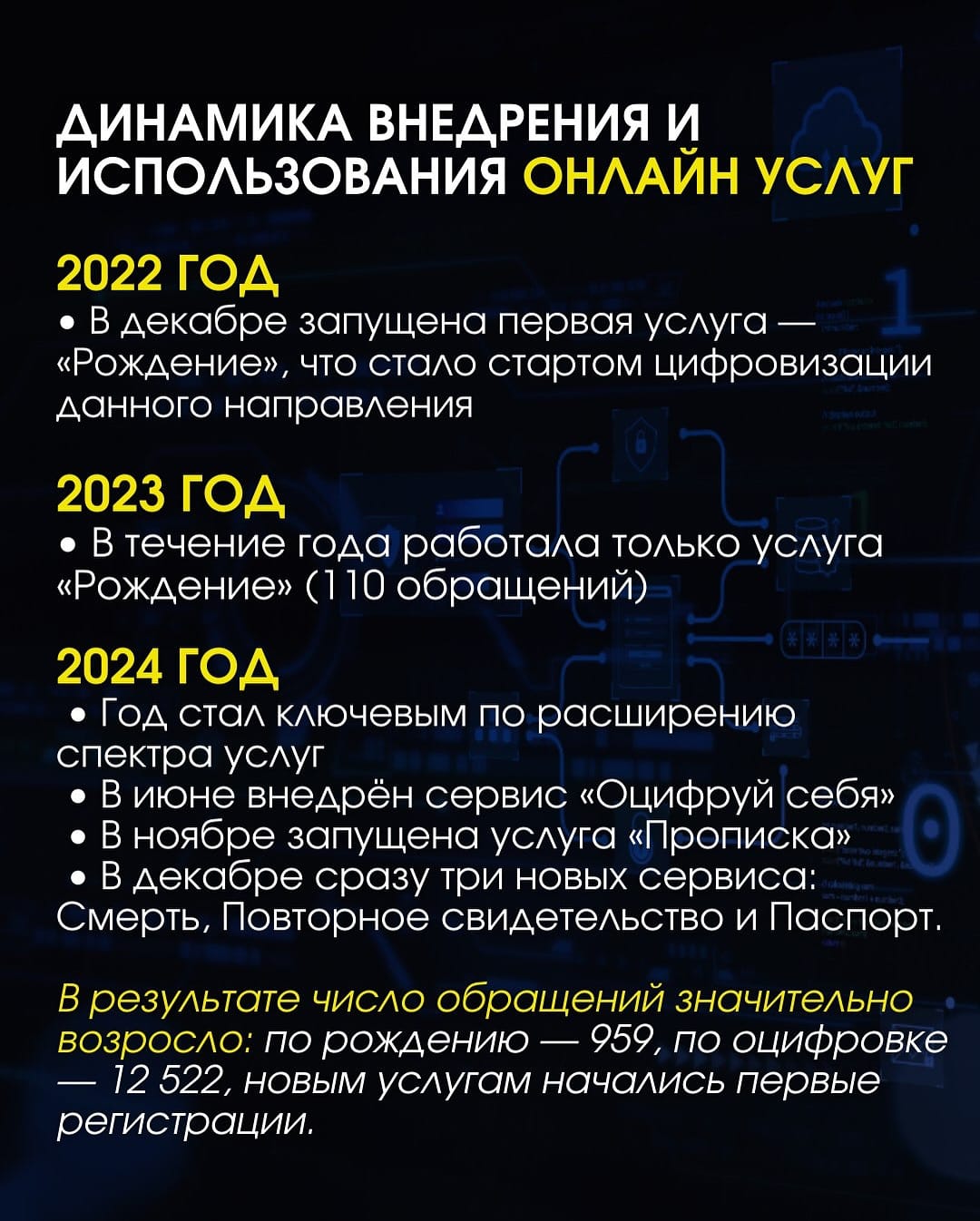 Для поддержки цифровизации открыт офис IT-блока, ведется строительство здания ГУ «Кызмат», полностью запущена облачная платформа G-Cloud. Новые центры обслуживания населения открыты: