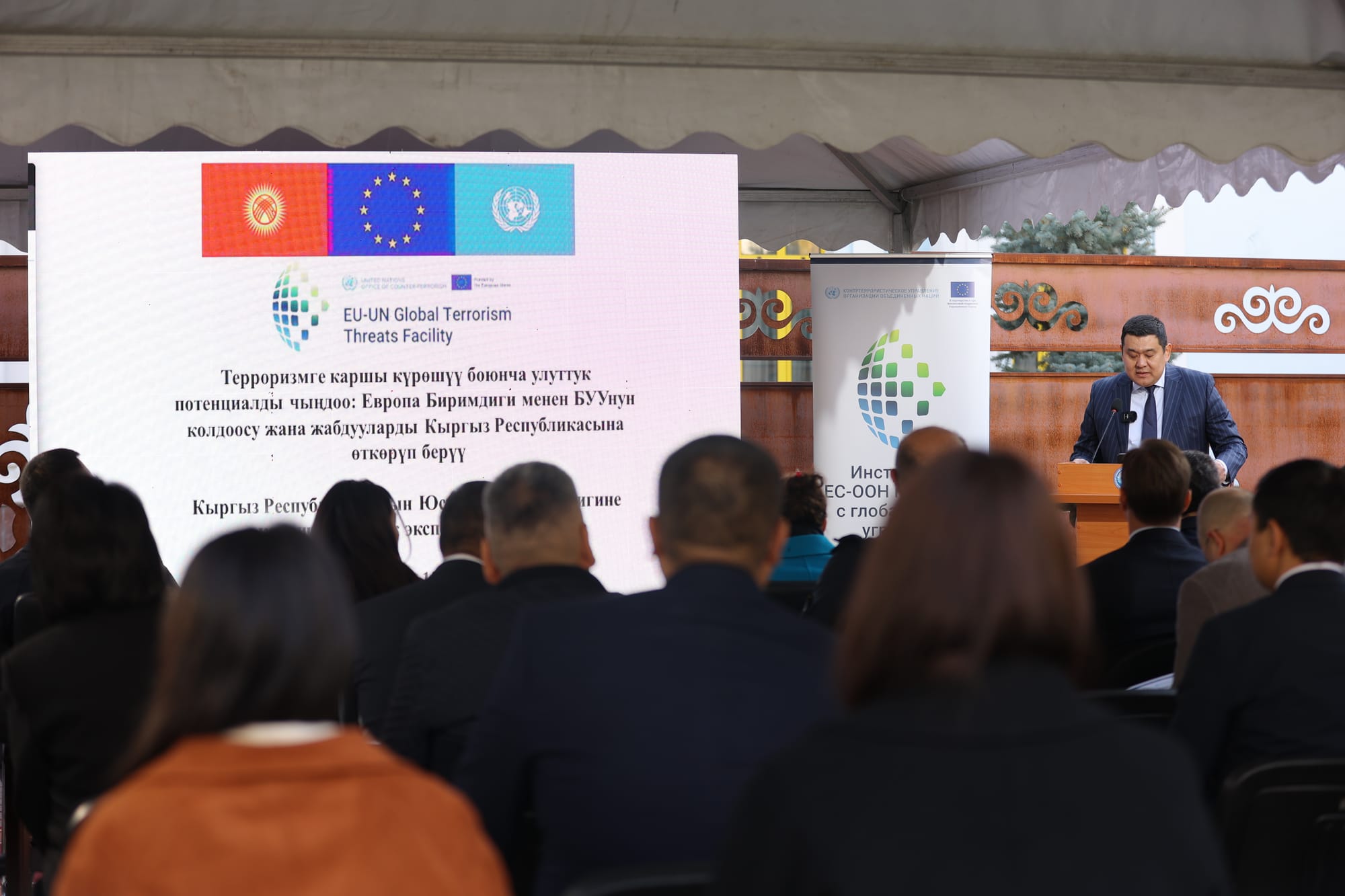 В мероприятии приняли участие первый заместитель министра юстиции Алмазбек Зарылбек уулу, председатель СЭС при МЮ КР Талантбек Кожонов, постоянный координатор ООН Антье Граве, глава отдела сотрудничества Представительства Европейского союза в КР Ханс Фарнхаммер, замдиректора Антитеррористического центра Госкомитета нацбезопасности Адыл Кадыралиев, а также руководитель проекта «Инструмент ЕС–ООН по борьбе с глобальными угрозами терроризма» Дмитрий Пономарев.