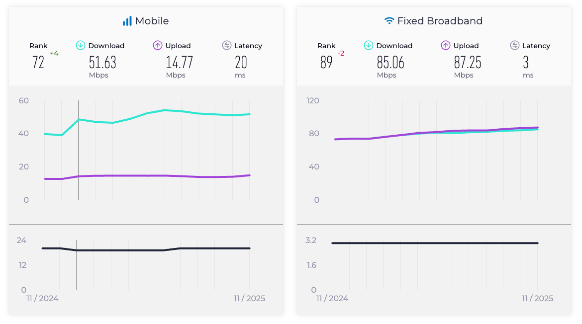 По данным Speedtest Global Index на ноябрь 2025 года, Кыргызстан улучшил позиции в рейтинге мобильного интернета и при этом немного опустился в сегменте фиксированного широкополосного доступа. В целом показатели скорости остаются стабильными и отражают поступательное развитие телеком-инфраструктуры КР.