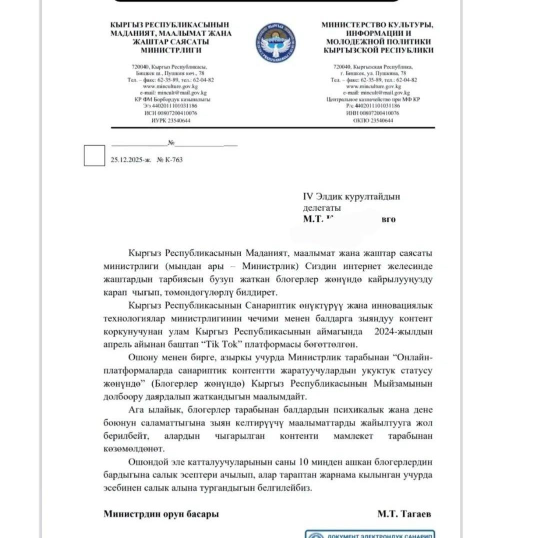 Поводом для обсуждения стало письмо за подписью замминистра культуры Марата Тагаева, которое распространили в сети. О нем сообщил журналист Эламан Карымшаков и приложил скрин ответа делегату Народного курултая. В тексте говорится, что министерство готовит проект закона «О правовом статусе создателей цифрового контента на онлайн-платформах» («О блогерах») и предлагает запретить блогерам распространение информации, которая может вредить психическому и физическому здоровью детей. Также в письме указано, что контент блогеров будет находиться под государственным контролем.