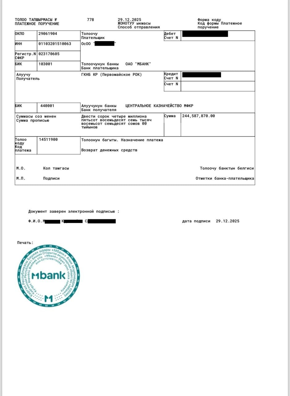 Государственный комитет национальной безопасности (ГКНБ) в ходе расследования коррупционных схем в Министерстве обороны добился полного возмещения ущерба в размере 244 млн 587 тысяч сомов, нанесенного государству частной компанией-поставщиком.