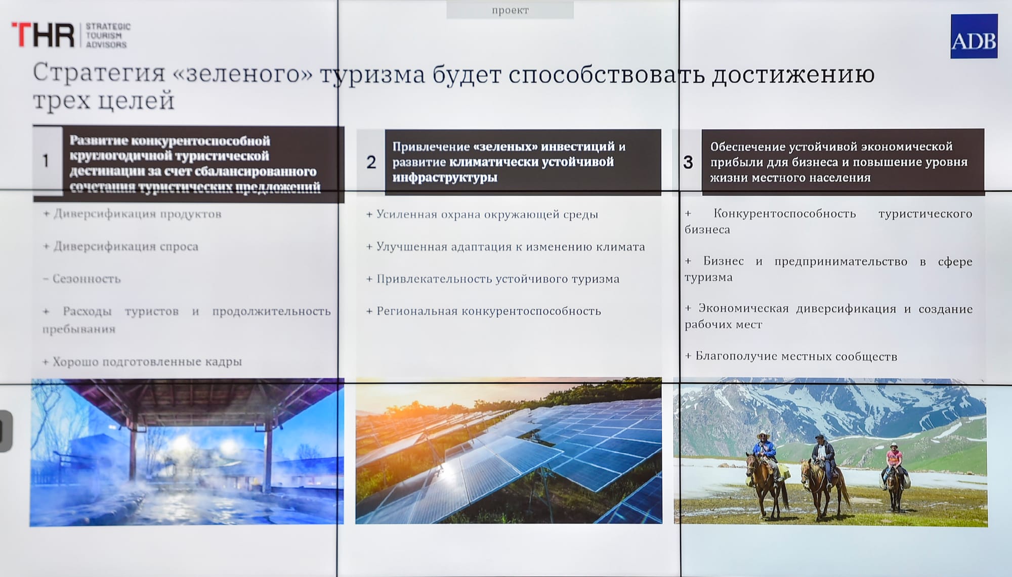 - Зеленый туризм — развитие экотуристических маршрутов, экологически устойчивых средств размещения, пеших и велосипедных маршрутов, а также меры по снижению нагрузки на горные экосистемы, озера и национальные парки.