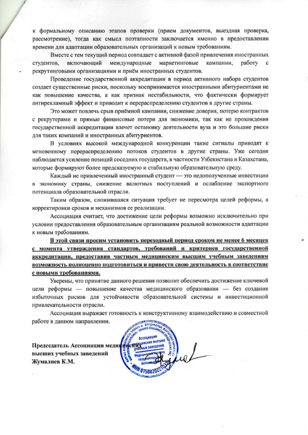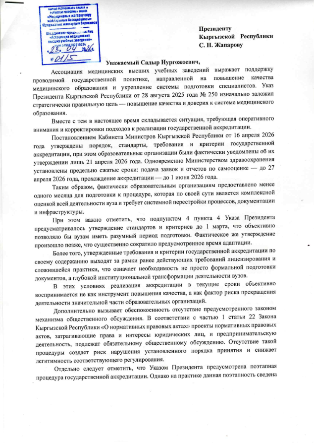 В письме говорится, что проблема возникла из-за крайне сжатых сроков. Постановление правительства со стандартами аккредитации вышло 16 апреля 2026 года, но вузы получили уведомления только 21 апреля. При этом Министерство здравоохранения требует подать все отчеты уже к 27 апреля, а завершить проверку – к 1 июня.