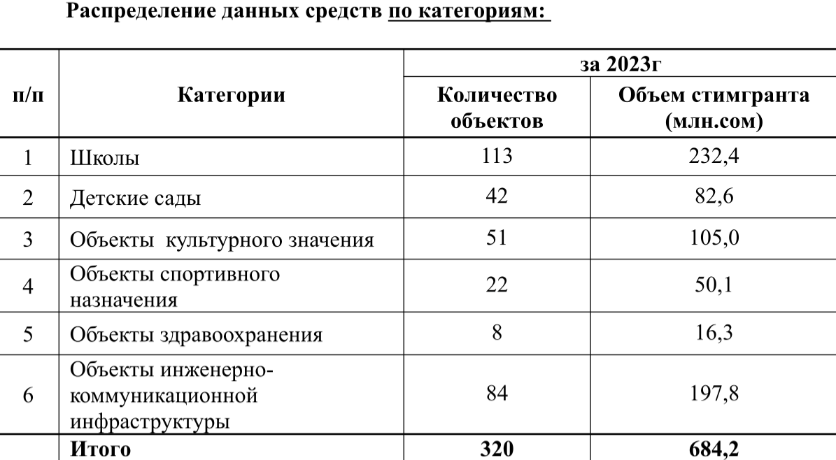 Уточненный план на 2023 год составил 695 млн сомов. В настоящее время работы завершены на 98,5%, реализовано 319 проектов на сумму 684.2 млн сомов. Один проект не был завершен в срок, так как подрядчик не выполнил работу, оговоренную сторонами.
