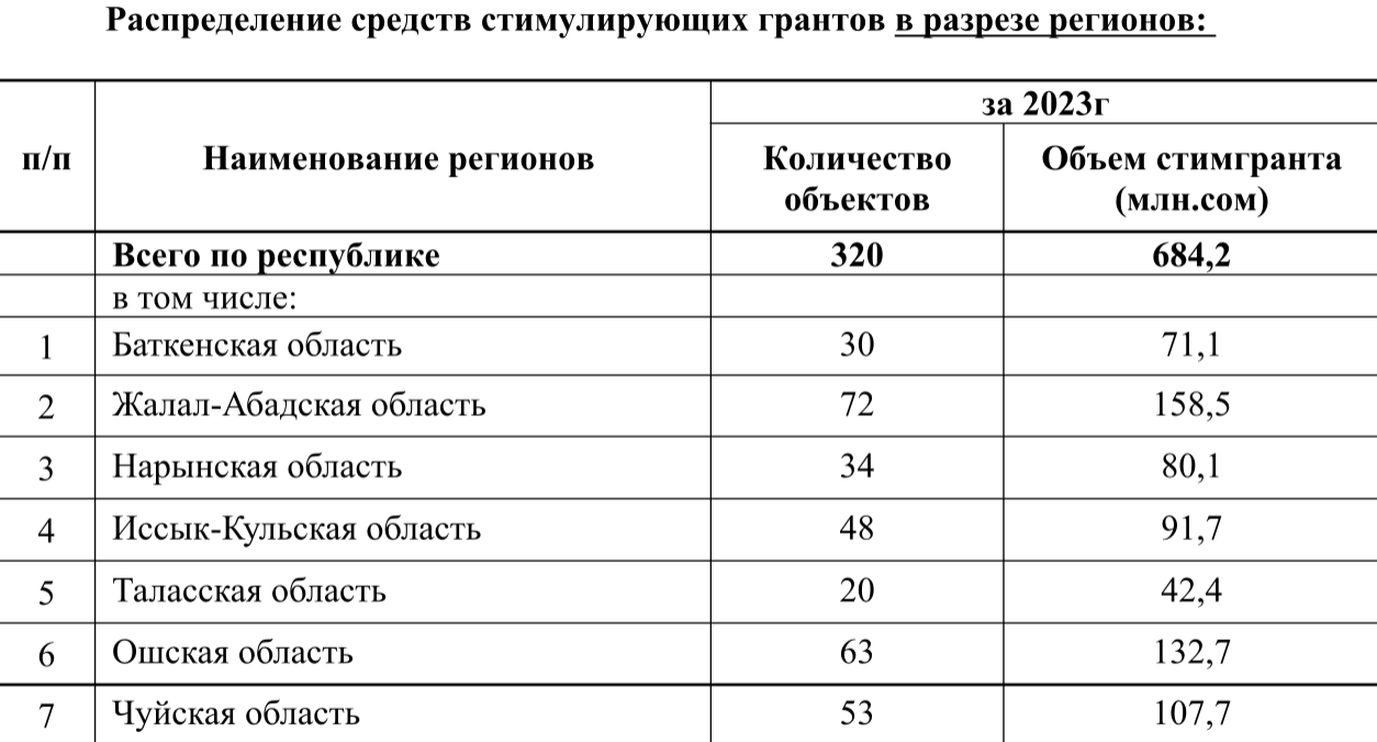 В ведомстве отметили, что в республиканском бюджете на 2023 год было предусмотрены 800 млн сомов в виде стимгрантов. Согласно протоколу заседания комиссии по утверждению проектов, за счет стимулирующих грантов в 2023 году должны были реализовать 332 проекта.