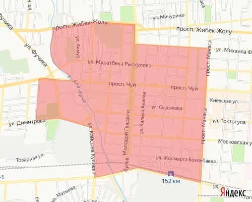 - проспект Дэн Сяопина — река Ала-Арча — улица Боконбаева — улица Кулиева — улица Московская — улица Фучика — улица Казакова.