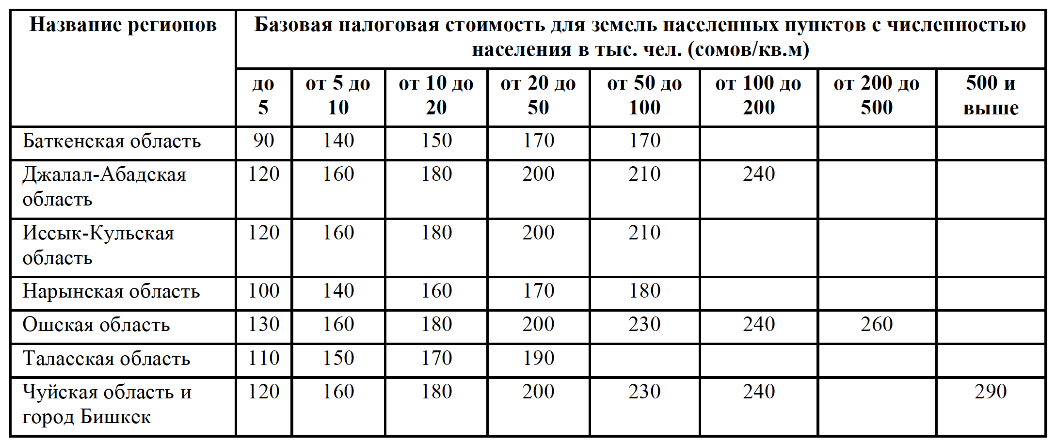 Базовая налоговая стоимость варьируется по регионам. Например, в Чуйской области и Бишкеке для населенных пунктов численностью от 200 до 500 тысяч человек она составит 240 сомов/м², от 500 тысяч — 290 сомов/м². В регионах с малой плотностью населения сумма стартует с 90 сомов/м².